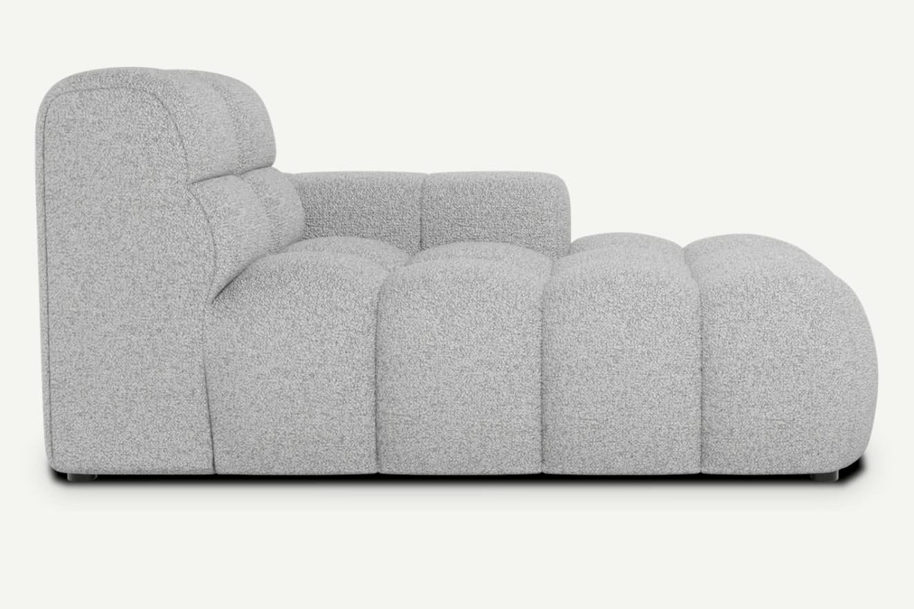 Szezlong Cloudy to modułowy element kolekcji, który pełni funkcję wygodnego zakończenia narożnika. Idealny do odpoczynku w pozycji półleżącej – tworzy komfortową strefę relaksu w nowoczesnym wnętrzu. Dzięki swojej formie świetnie równoważy bardziej zabudowaną stronę narożnika, dodając całości lekkości. Bryła idealnie komponuje się z pozostałymi modułami z tej samej kolekcji.