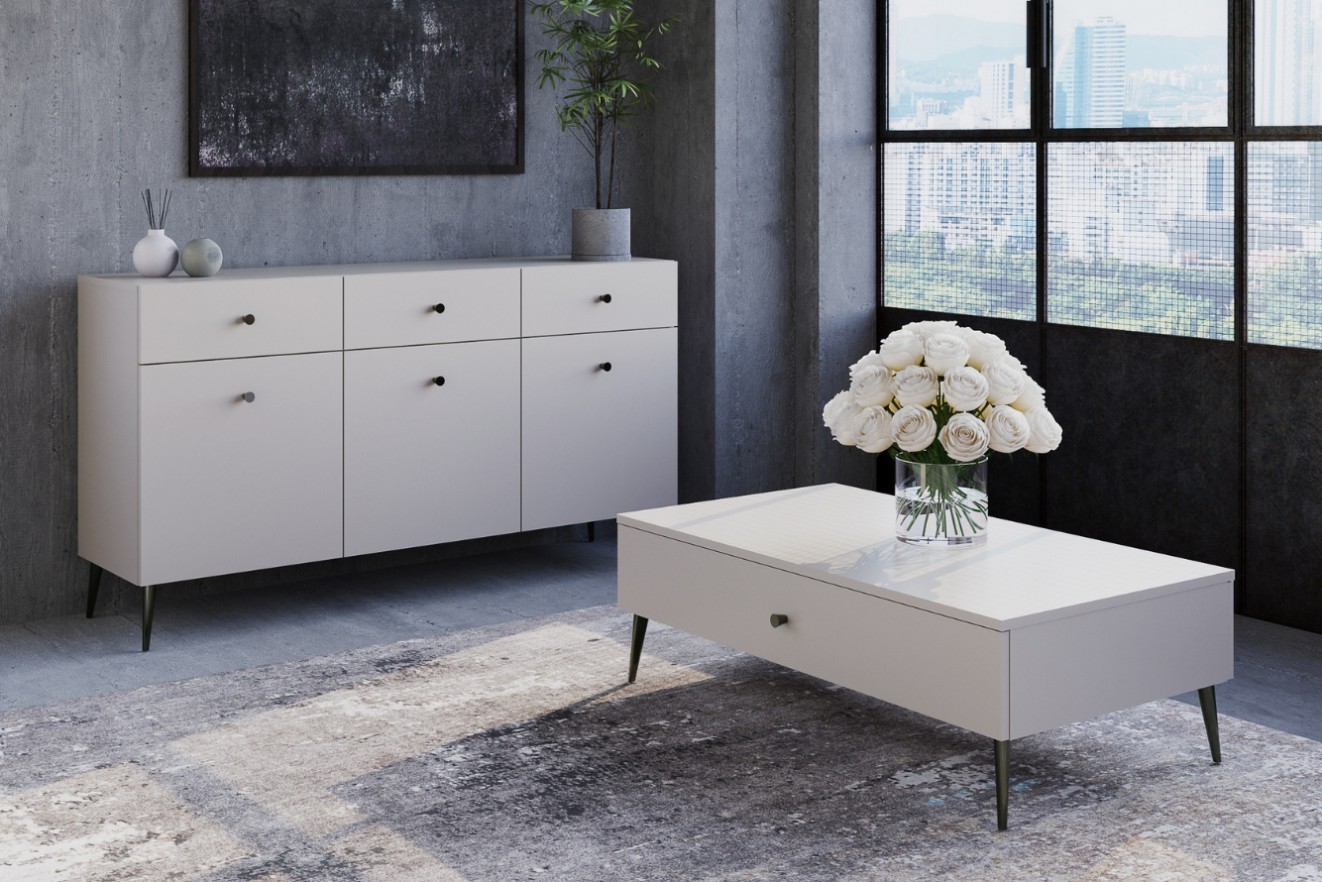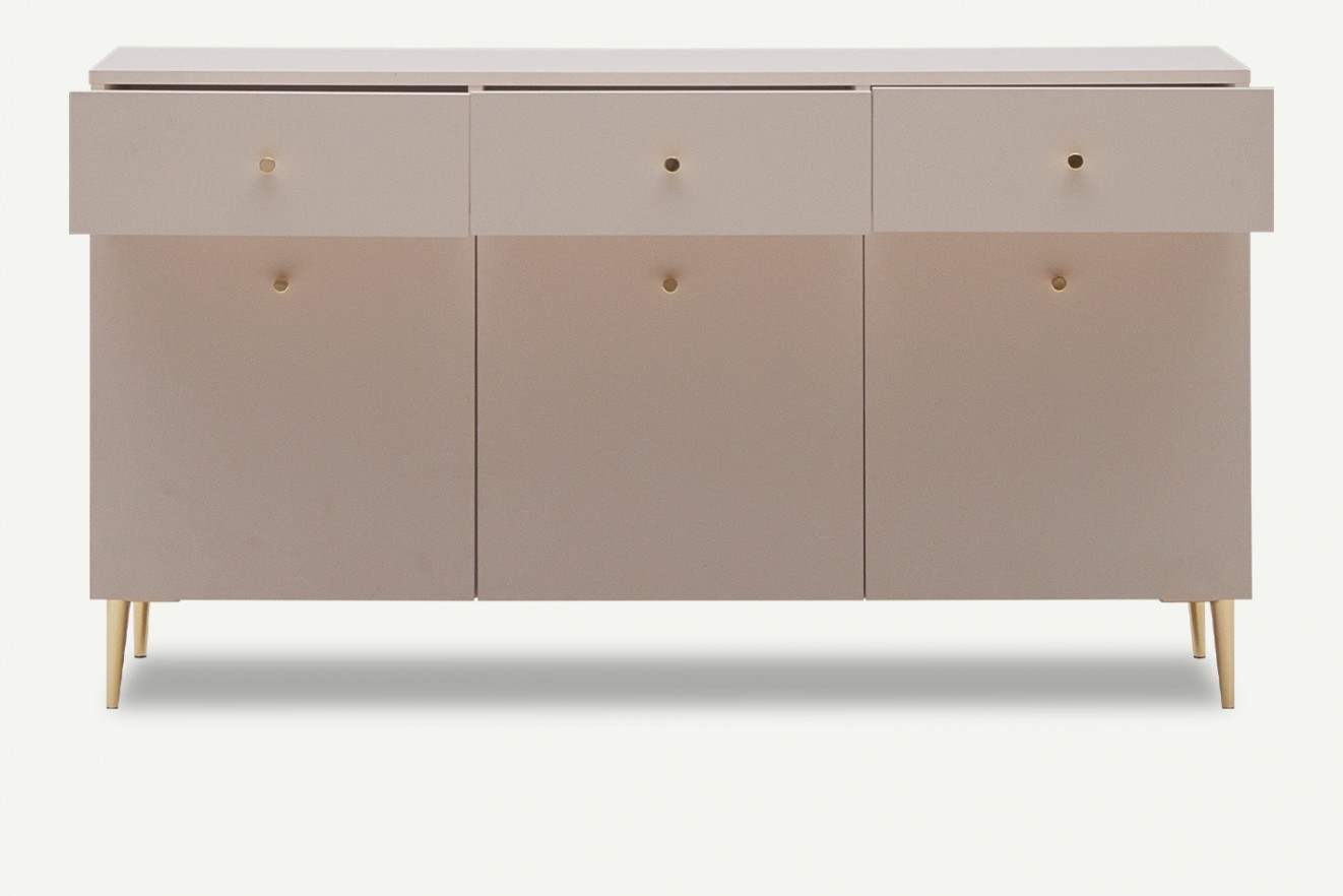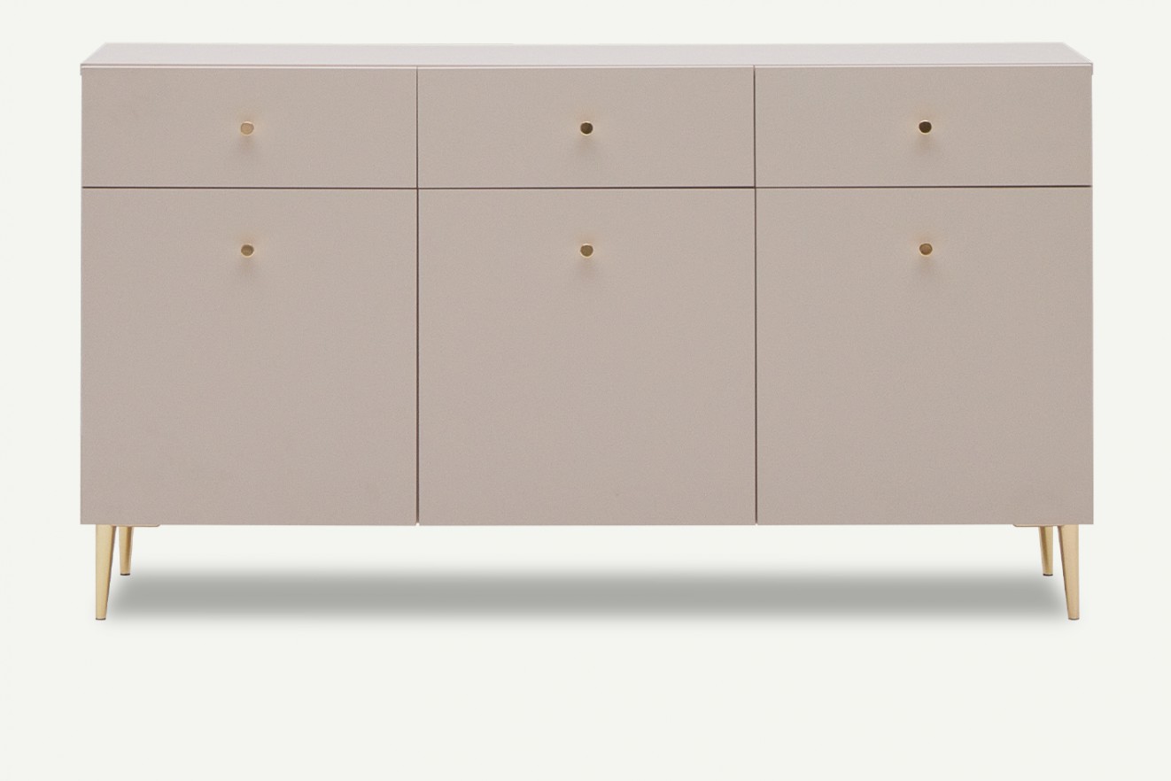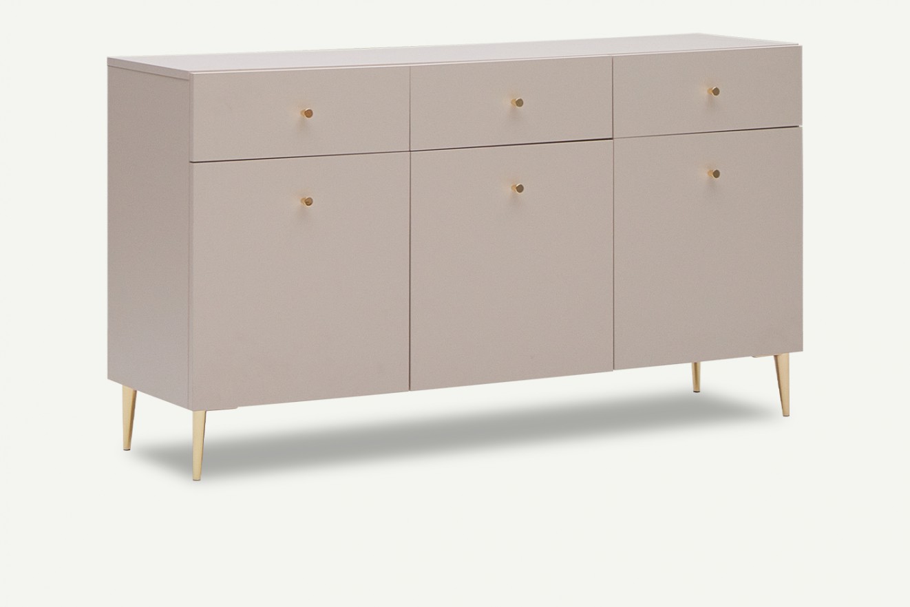 Duża komoda Maya została zaprojektowana jako praktyczne rozwiązanie dla osób, które potrzebują przestronnego i jednocześnie estetycznego miejsca do przechowywania. Dzięki swojej szerokości mebel oferuje dużo miejsca na akcesoria, dokumenty, tekstylia oraz elementy wyposażenia domowego, zachowując przy tym lekką i nowoczesną formę.