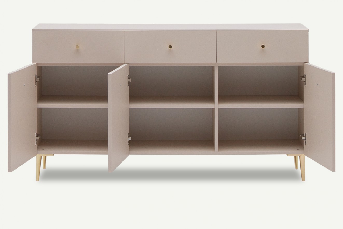 Wnętrze komody podzielono na zamykane szafki oraz otwarte półki, które pomagają w wygodnej organizacji. Zamknięte fronty umożliwiają przechowywanie rzeczy, które lepiej ukryć, natomiast otwarta część stanowi praktyczne miejsce na elementy używane na co dzień lub dekoracje. Taki podział sprawia, że komoda sprawdza się zarówno w salonie, jadalni, jak i w domowym biurze.