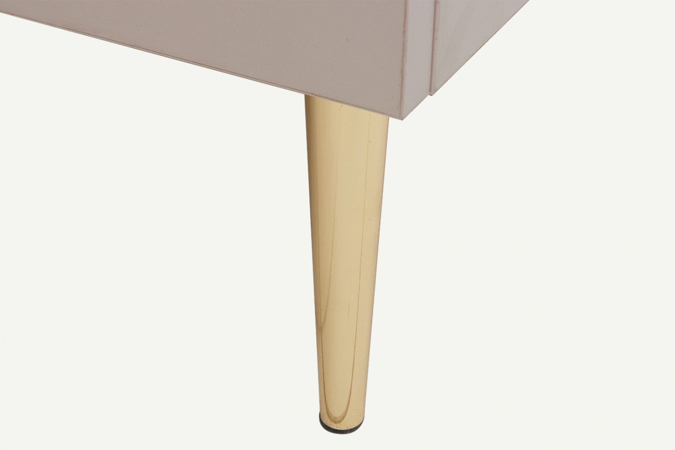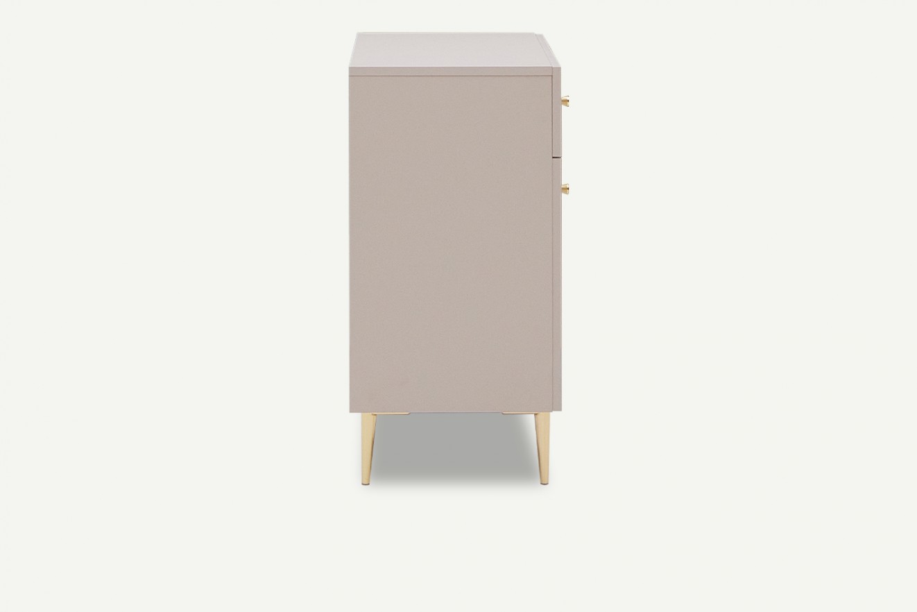 Korpus wykonano z trwałej płyty laminowanej, a obrzeża zabezpieczono ABS-em, co zwiększa odporność mebla na codzienne użytkowanie. Komoda osadzona jest na smukłych, stabilnych nogach, które nadają jej wizualnej lekkości, a jednocześnie ułatwiają utrzymanie porządku pod meblem. Starannie dobrane uchwyty dopełniają całości, podkreślając minimalistyczny charakter kolekcji Maya.