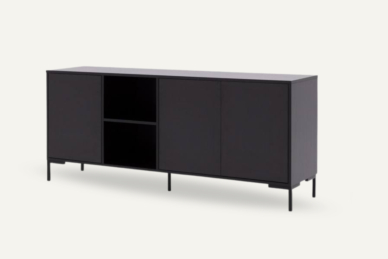 Mebel został wyposażony w trzy zamykane szafki oraz otwarte półki, które umożliwiają organizację dokumentów, akcesoriów dekoracyjnych czy sprzętu multimedialnego. System push to open eliminuje konieczność stosowania uchwytów, zapewniając elegancki i nowoczesny wygląd.