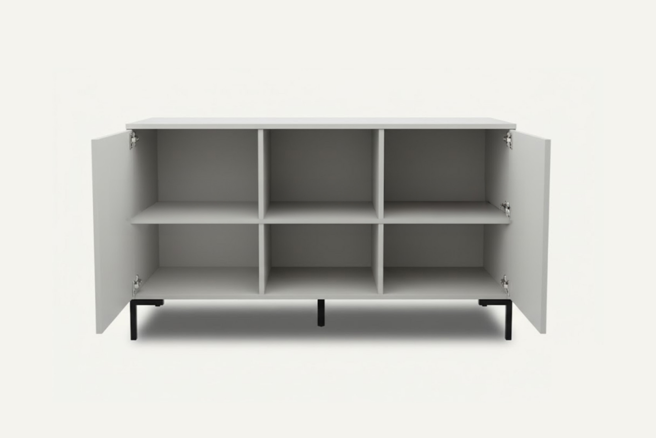 Wnętrze komody skrywa pojemne szafki oraz funkcjonalne półki, które ułatwiają organizację przedmiotów, dokumentów lub elementów wyposażenia. Gładkie fronty współpracują z mechanizmem push to open, dzięki czemu otwieranie drzwiczek jest płynne i wygodne, a cała bryła zyskuje estetyczny, uporządkowany wygląd.