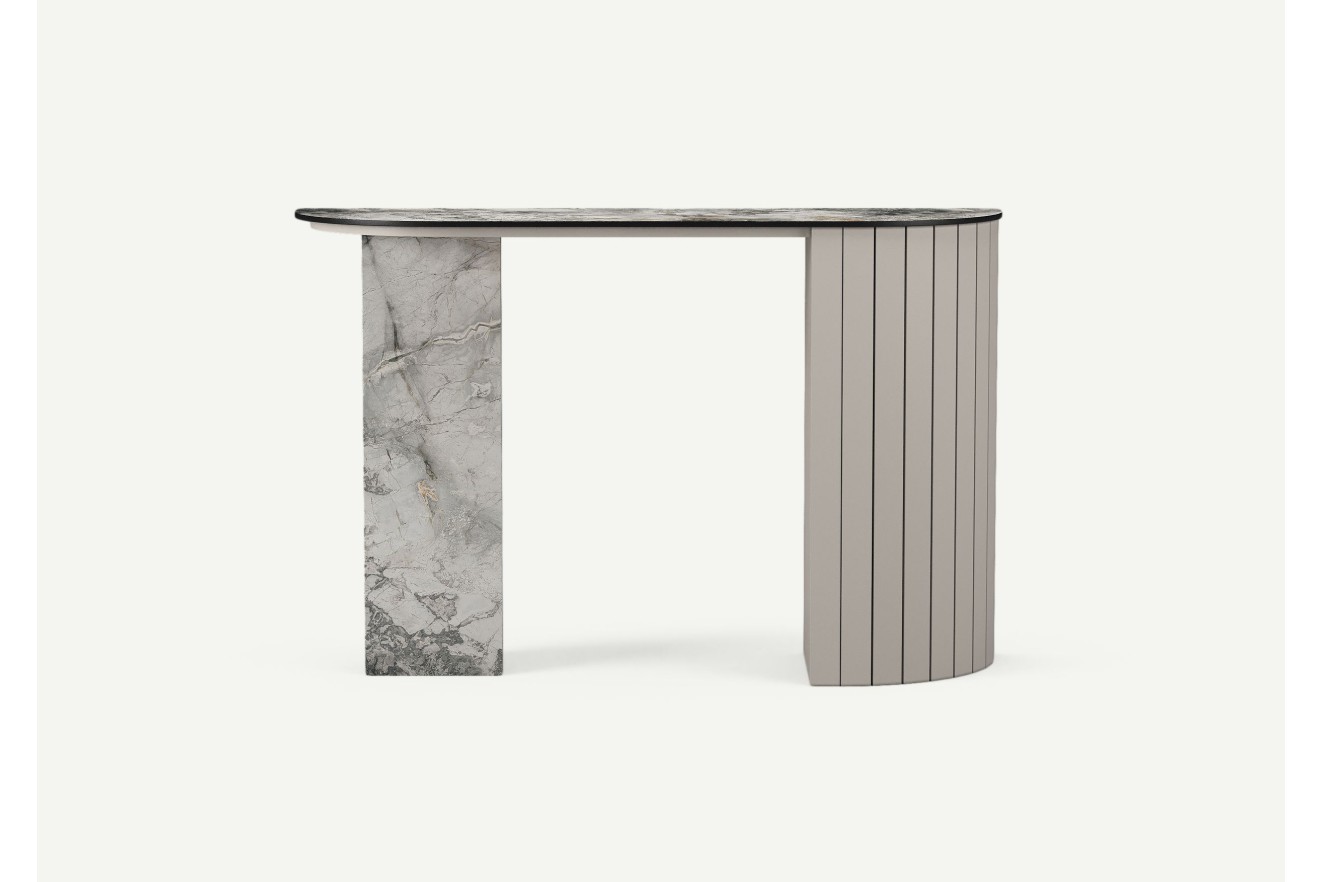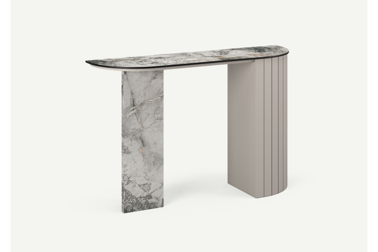 Stylowa konsola z kolekcji MILA z korpusem kaszmir o wymiarach 120x33x77 cm, metalowe nogi w czarnym połysku. Idealna jako podstawa dekoracyjna w przedpokoju, salonie czy jadalni. Łączy funkcjonalność z eleganckim wzornictwem marmurowym.