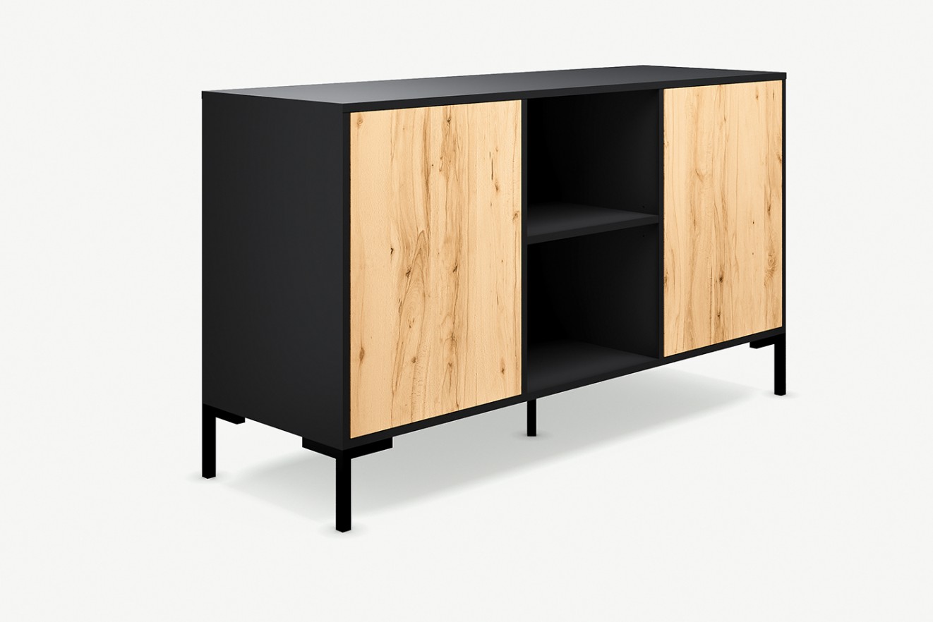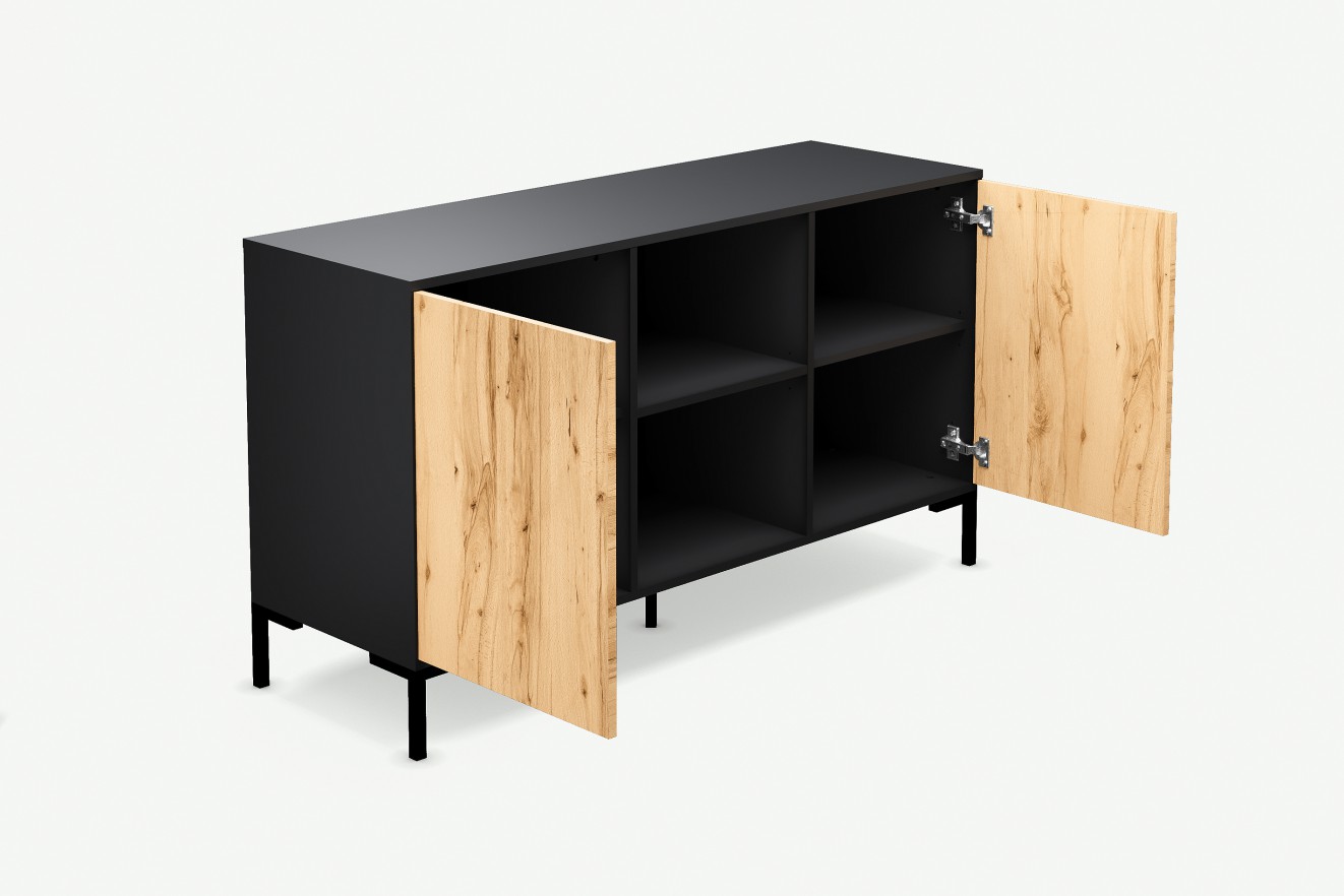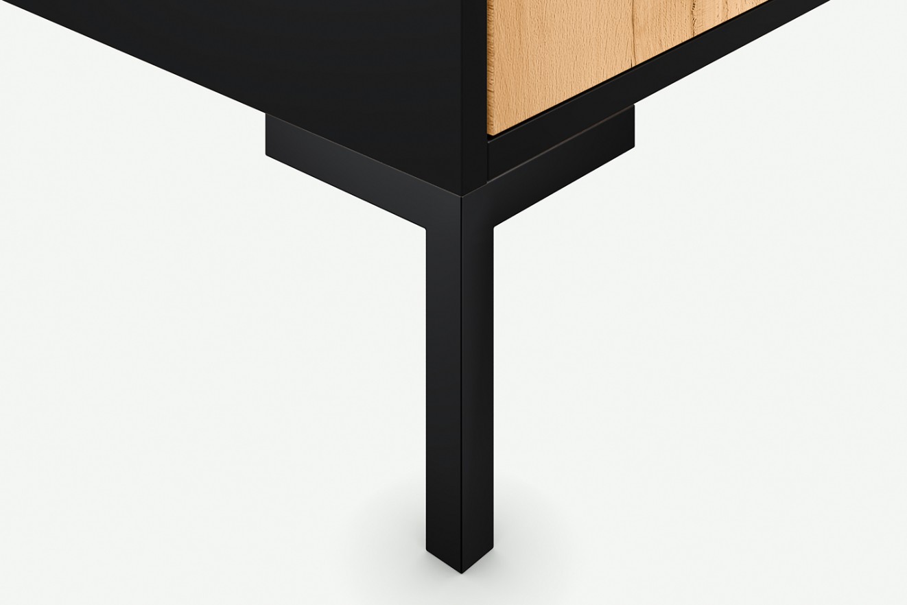 Mebel stoi na stabilnych, smukłych nogach o nowoczesnym charakterze – oprócz wizualnej lekkości zapewniają również łatwy dostęp do przestrzeni pod komodą, co ułatwia utrzymanie porządku. Dzięki neutralnej formie komoda dobrze komponuje się zarówno z surowymi aranżacjami loftowymi, jak i z bardziej przytulnymi, domowymi wnętrzami.