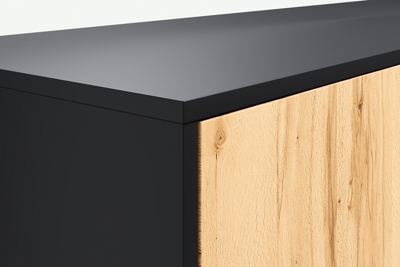 Komoda została zaprojektowana tak, aby sprawdziła się w różnych typach wnętrz – od nowoczesnych po bardziej klasyczne. Jej uniwersalny charakter wynika z prostej, minimalistycznej formy oraz starannie dopracowanych detali, które podkreślają solidne wykonanie. Korpus i fronty wykonano z wytrzymałej płyty laminowanej zabezpieczonej obrzeżem ABS, dzięki czemu mebel dobrze radzi sobie w codziennym użytkowaniu.