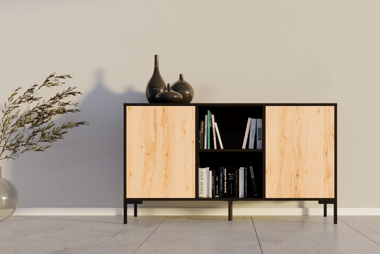 Funkcjonalna komoda w nowoczesnym stylu, zaprojektowana z myślą o wygodnym przechowywaniu i codziennym użytkowaniu. Przemyślany układ półek i szafek ułatwia organizację przestrzeni, a stabilna podstawa nadaje meblowi lekkiego, współczesnego charakteru. Mebel dostarczany jest w całości i nie wymaga montażu.