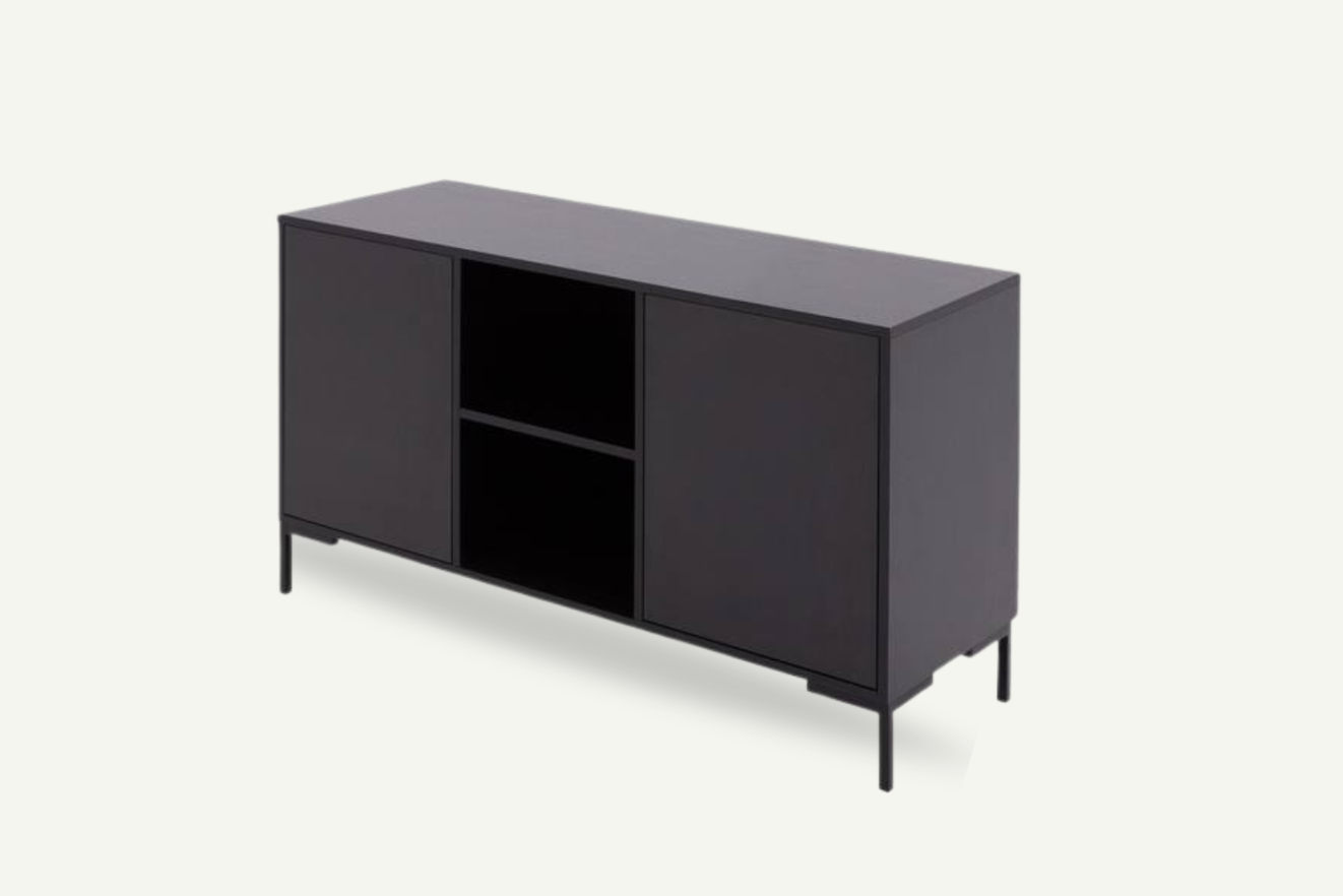 Mebel stoi na stabilnych, smukłych nogach o nowoczesnym charakterze – oprócz wizualnej lekkości zapewniają również łatwy dostęp do przestrzeni pod komodą, co ułatwia utrzymanie porządku. Dzięki neutralnej formie komoda dobrze komponuje się zarówno z surowymi aranżacjami loftowymi, jak i z bardziej przytulnymi, domowymi wnętrzami.