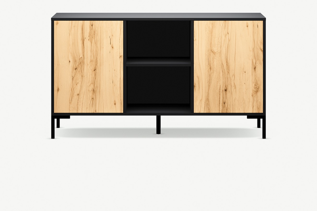 Praktyczna komoda o współczesnej, lekkiej formie. Zapewnia wygodne miejsce do przechowywania dzięki pojemnym szafkom i otwartym półkom, a jej solidna konstrukcja sprawdzi się w codziennym użytkowaniu. Mebel dostarczany jest w całości i nie wymaga montażu.