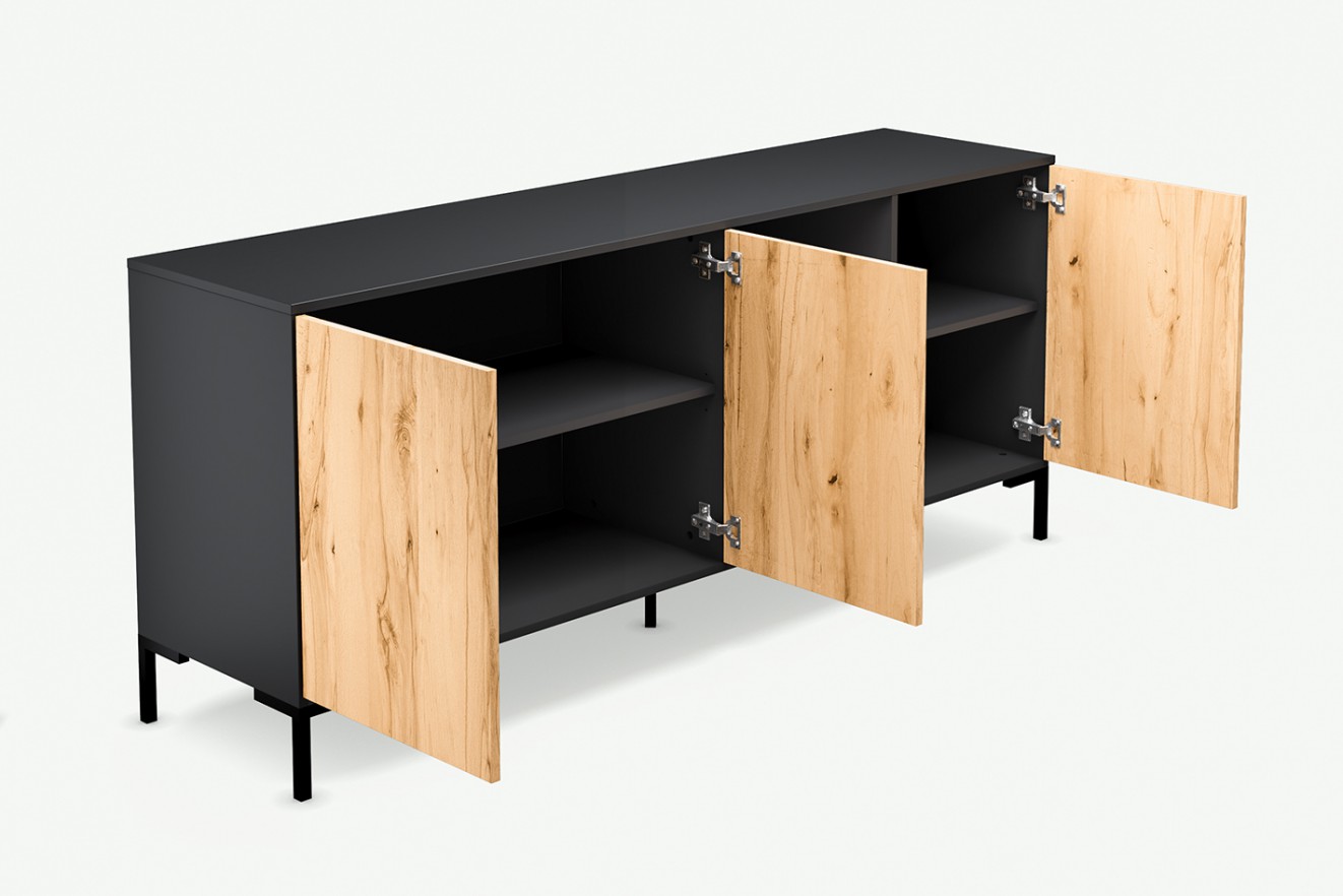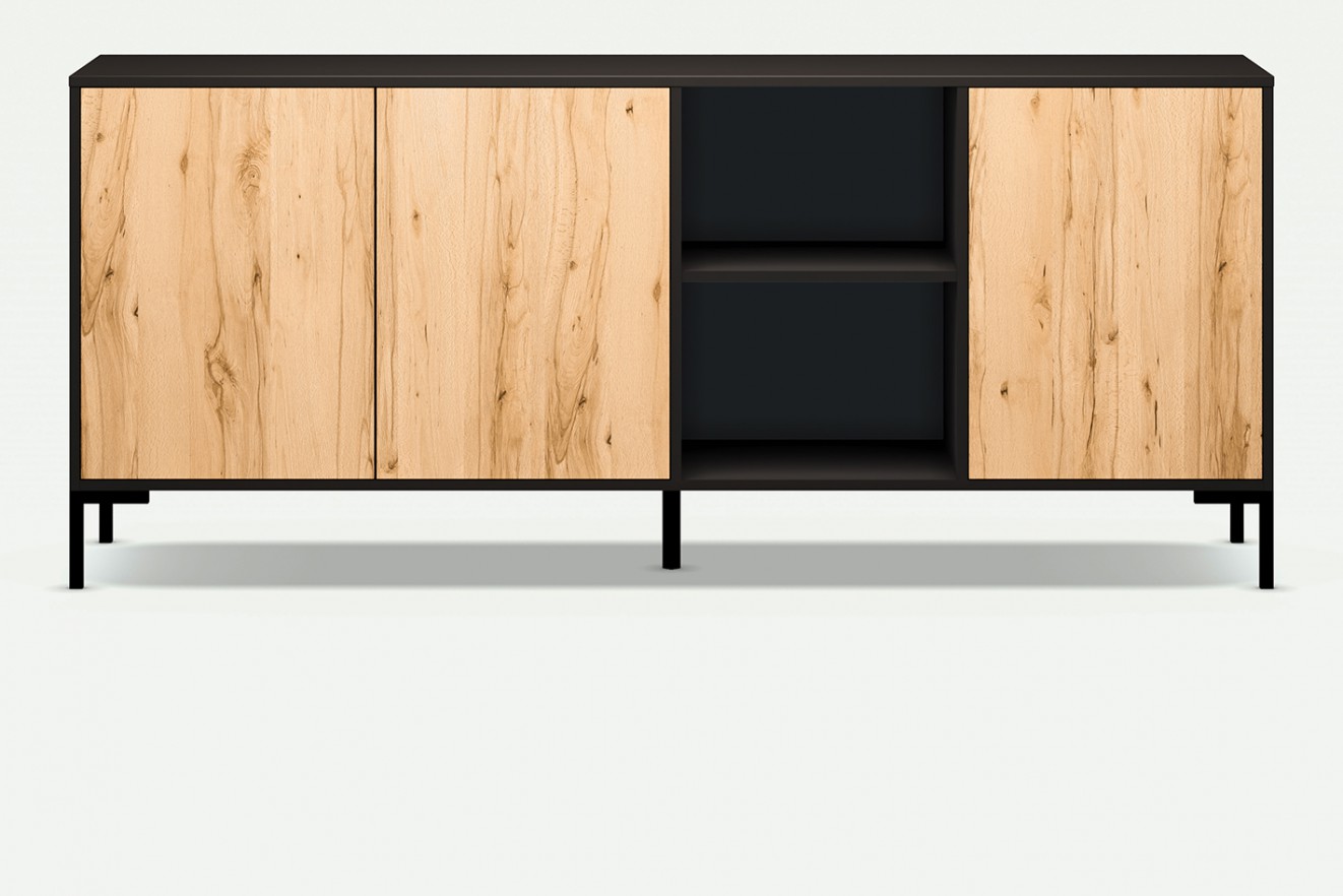 Model wyposażono w trzy zamykane szafki, które pomagają utrzymać porządek i ukryć przedmioty codziennego użytku. Otwarta półka stanowi dodatkową przestrzeń na dekoracje, dokumenty lub sprzęt multimedialny. Zastosowany system push to open eliminuje potrzebę stosowania uchwytów, dzięki czemu cała bryła jest spójna i minimalistyczna.