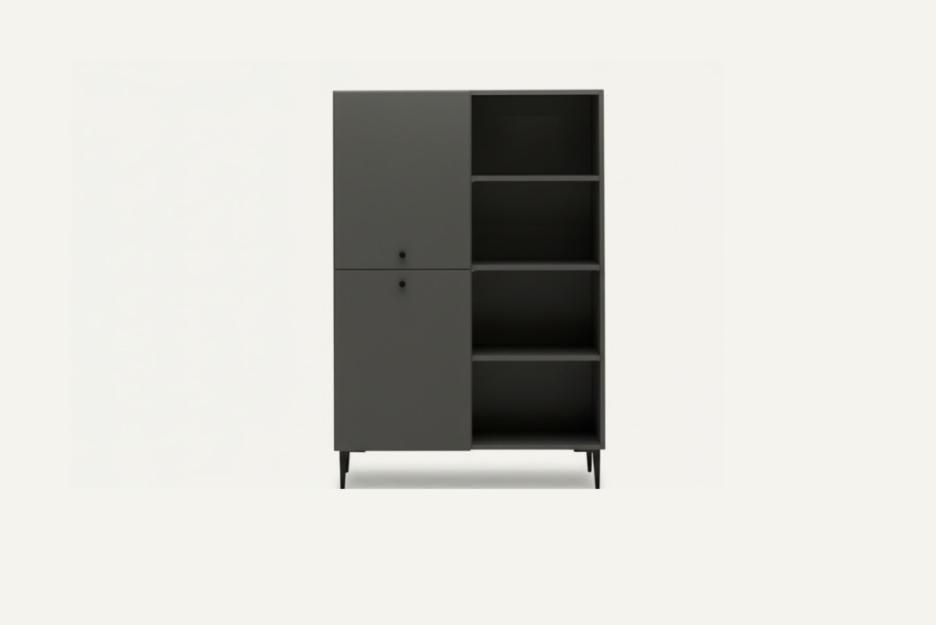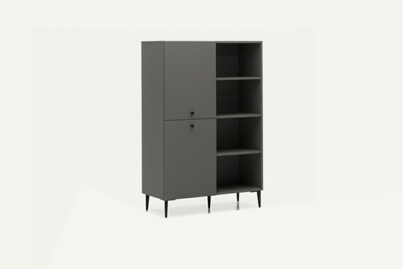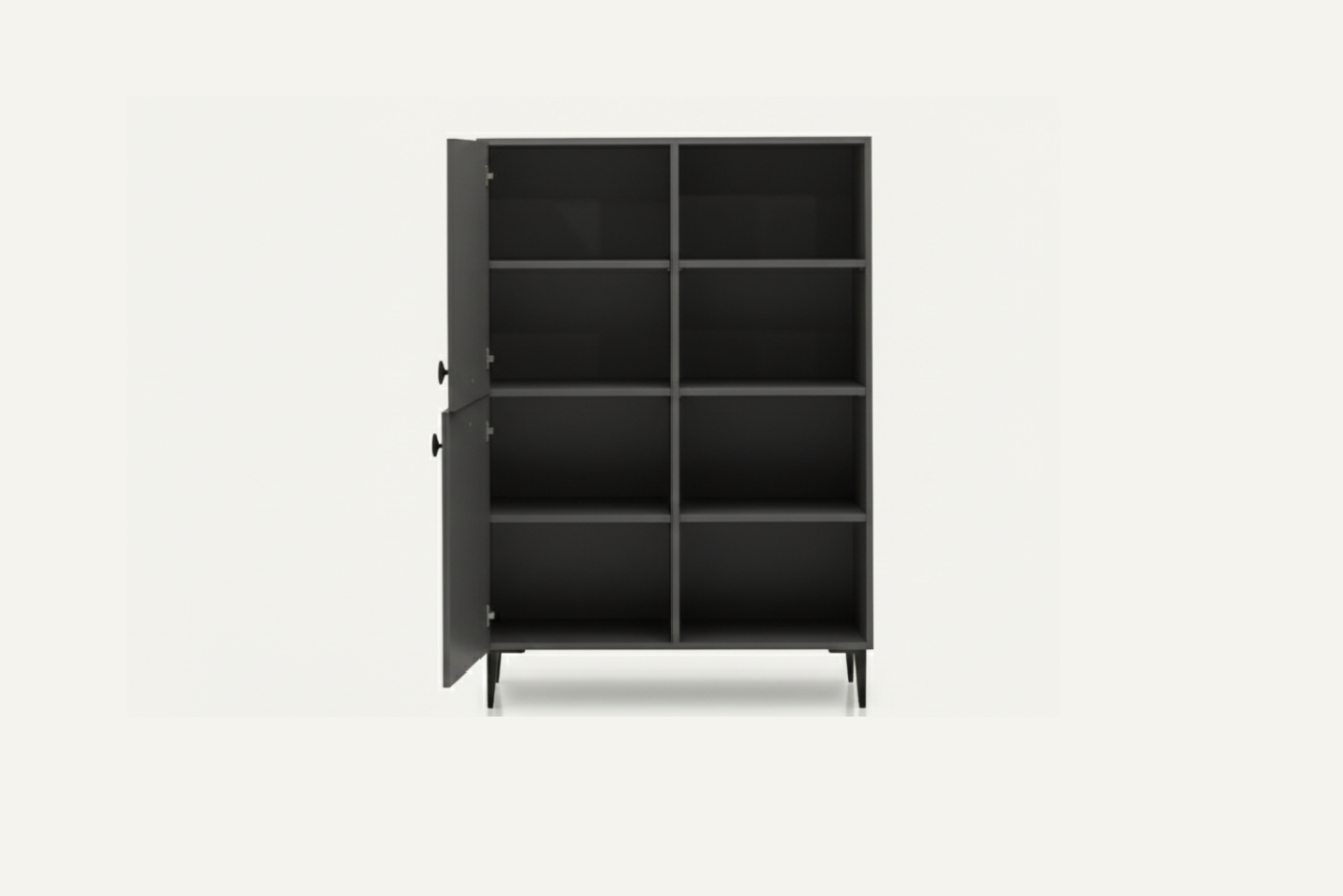 Wysoka witryna Maya w kolorze antracyt to elegancki i funkcjonalny mebel, który oferuje dużo miejsca do przechowywania. Pojemne półki i zamykane fronty pozwalają utrzymać porządek, a nowoczesna forma świetnie prezentuje się w wielu aranżacjach. Mebel dostarczany w całości — nie wymaga montażu.