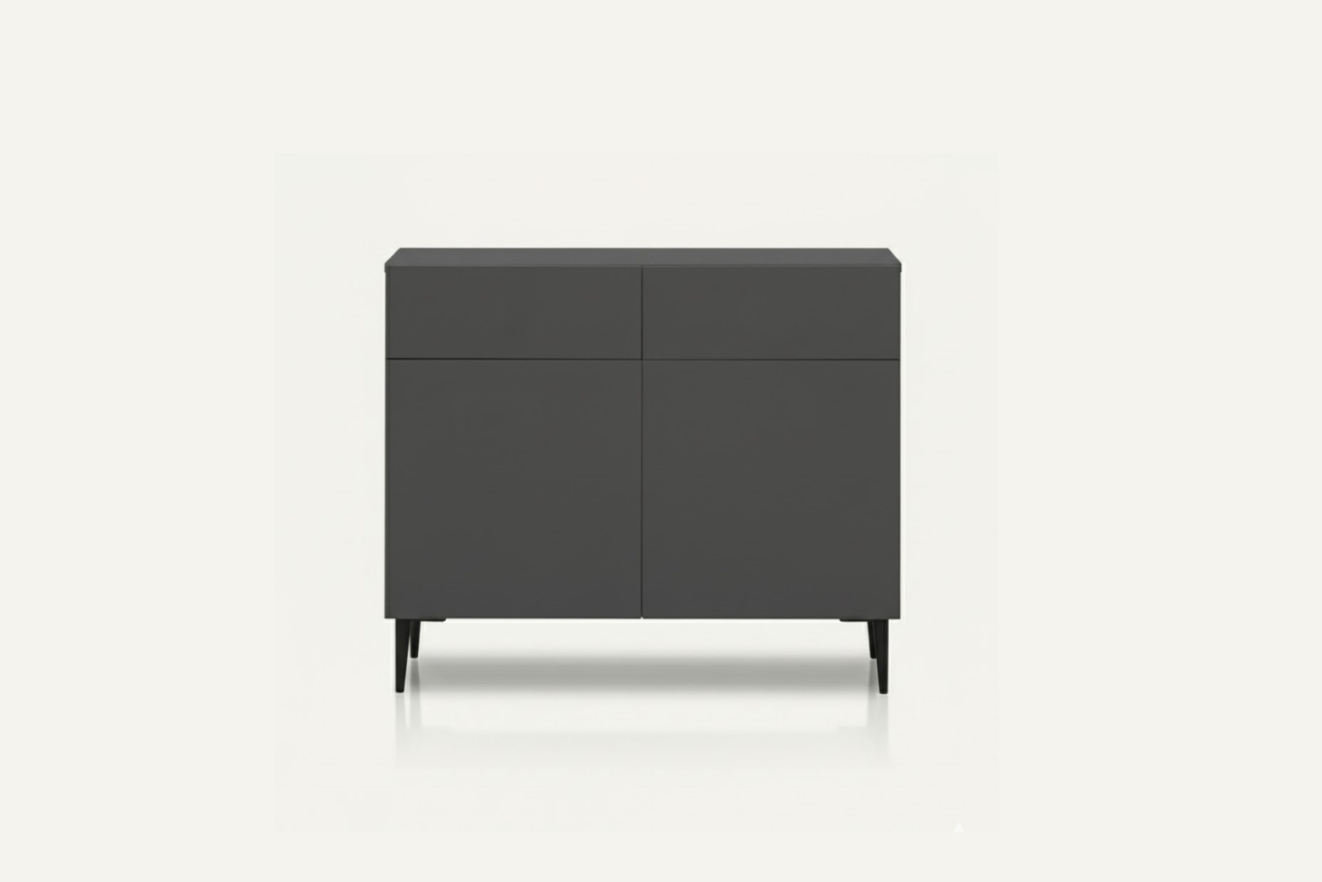 W górnej części komody znajdują się dwie szuflady idealne na drobne akcesoria. Poniżej umieszczono dwie zamknięte komory zapewniające miejsce na dokumenty, tekstylia lub inne przedmioty wymagające uporządkowania.