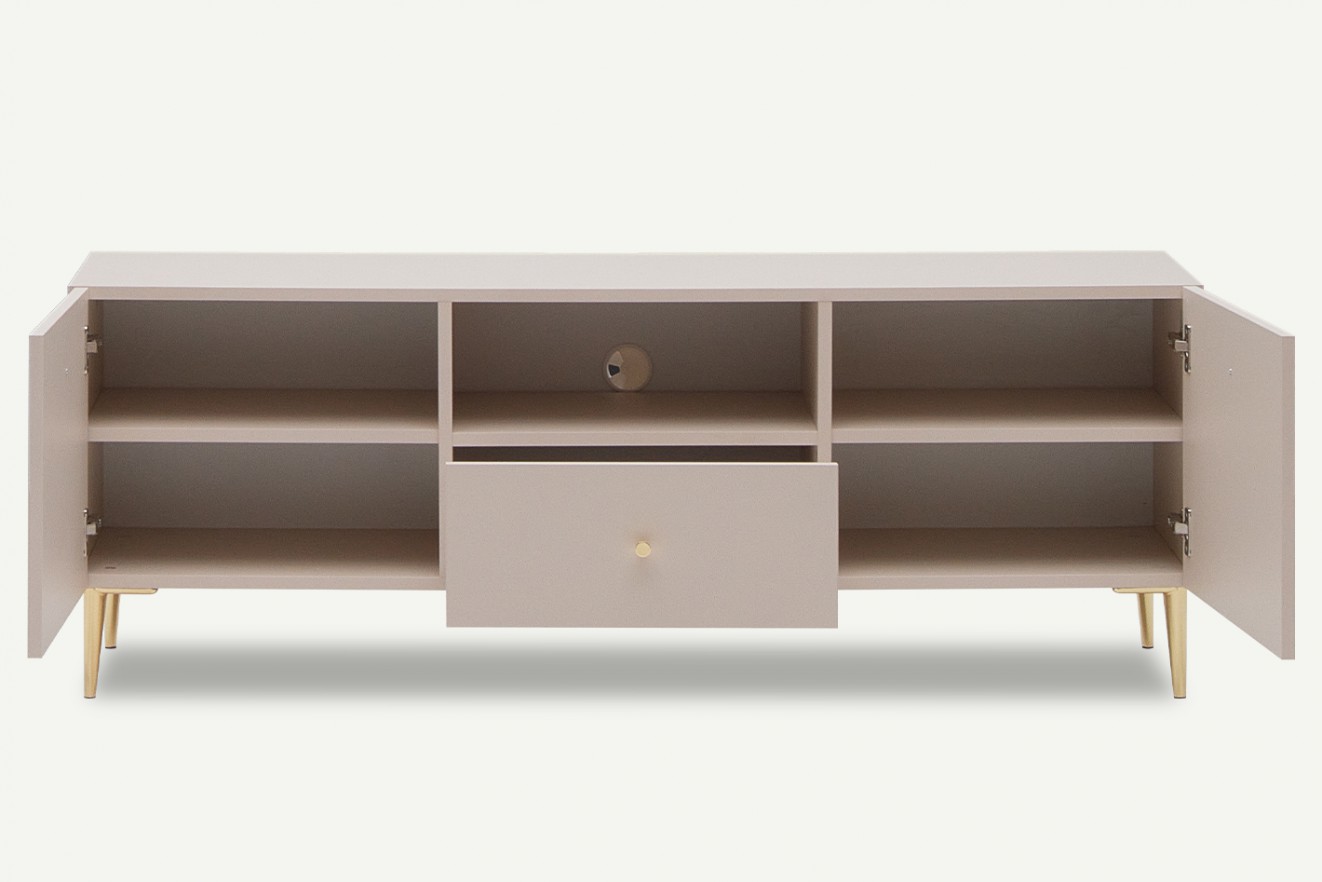 Układ wnętrza obejmuje zamykane szafki oraz otwarte półki, które pozwalają przechować sprzęt RTV, akcesoria i elementy codziennego użytku. Otwarte wnęki zapewniają łatwy dostęp do urządzeń takich jak konsola czy dekoder, a zamknięte części pomagają ukryć przedmioty, które nie muszą być widoczne. Dzięki temu szafka pozwala utrzymać estetyczny porządek w salonie lub pokoju telewizyjnym.