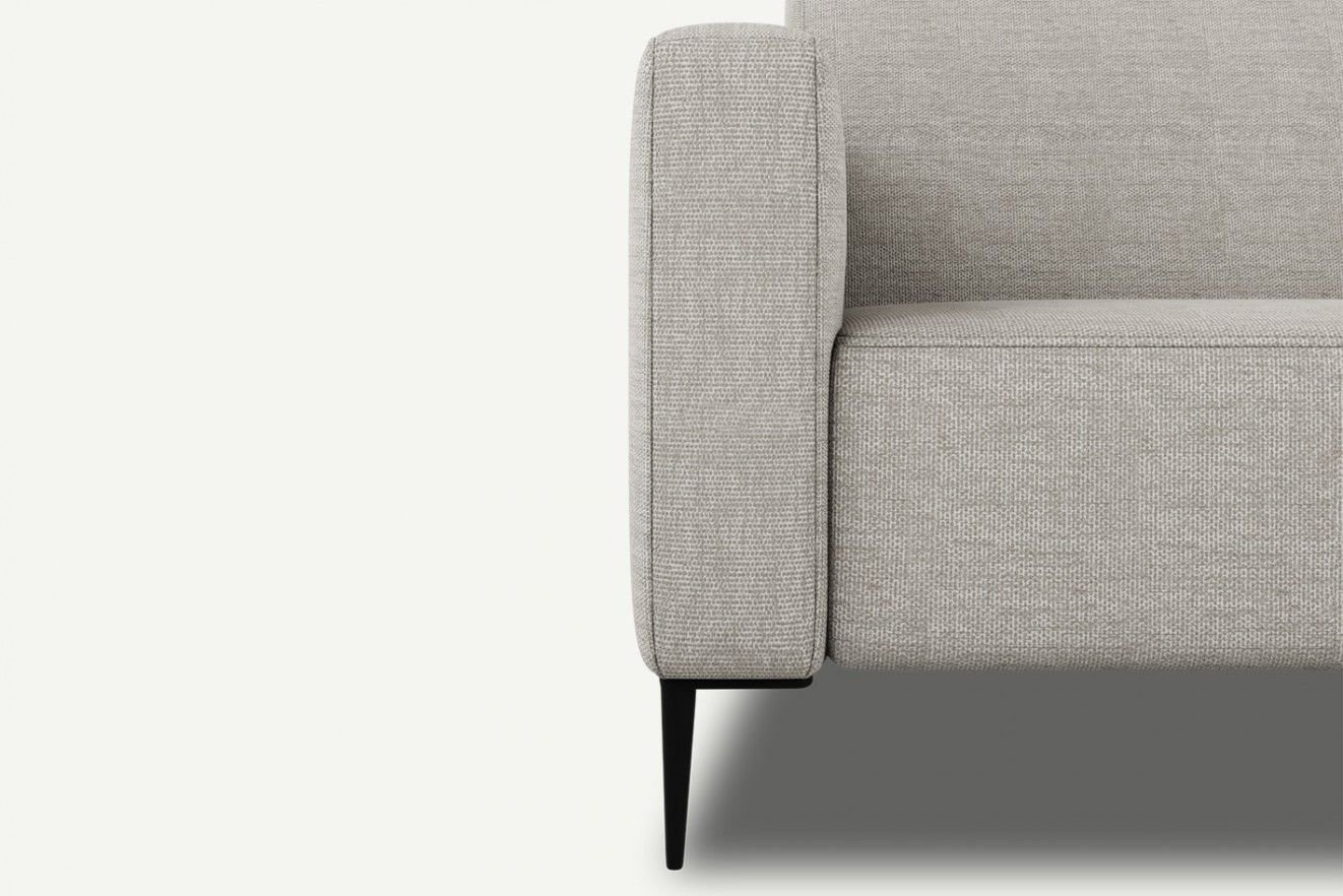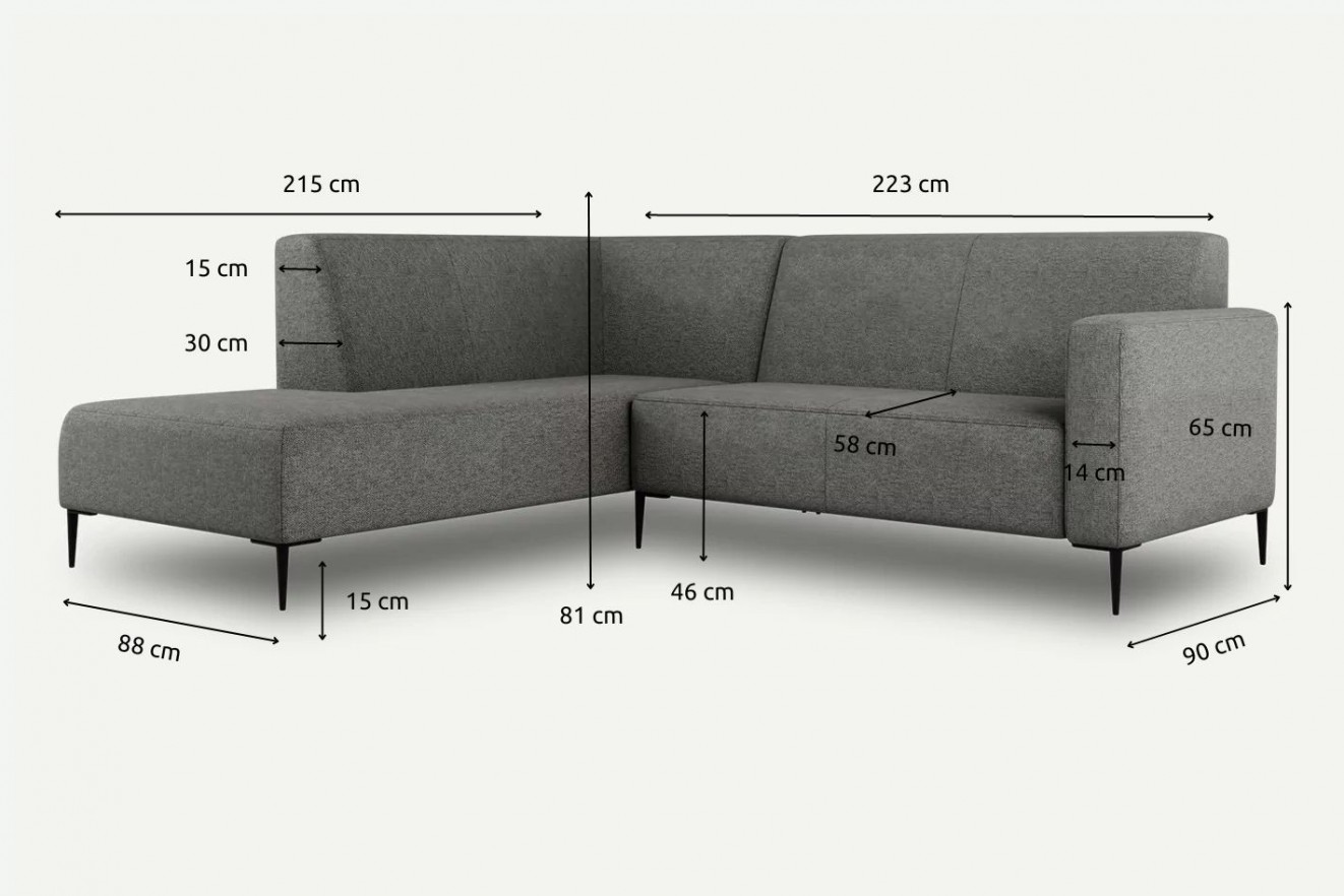 Narożnik Bolder w wersji 223x215 cm to propozycja dla tych, którzy szukają kompaktowego, ale wciąż bardzo wygodnego mebla wypoczynkowego. Prosty, geometryczny kształt i wąskie boczki nadają mu lekkości, a wysokie, czarne metalowe nogi podkreślają jego nowoczesny, lekko loftowy charakter.