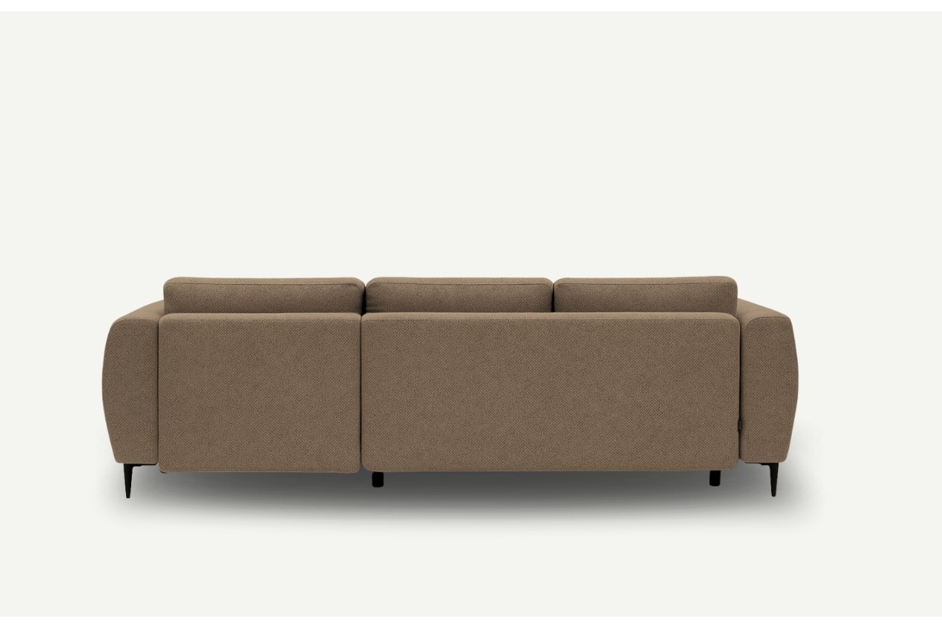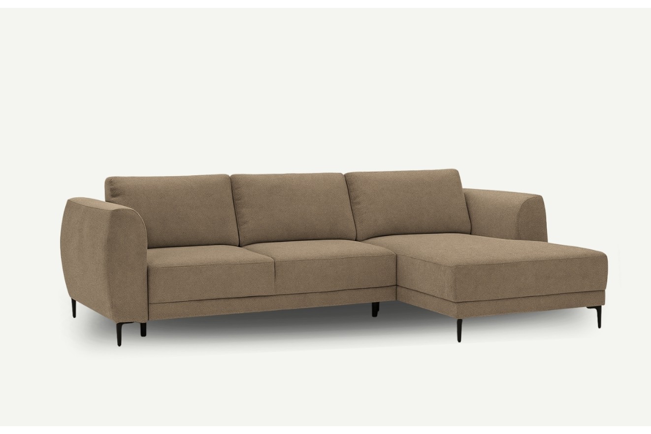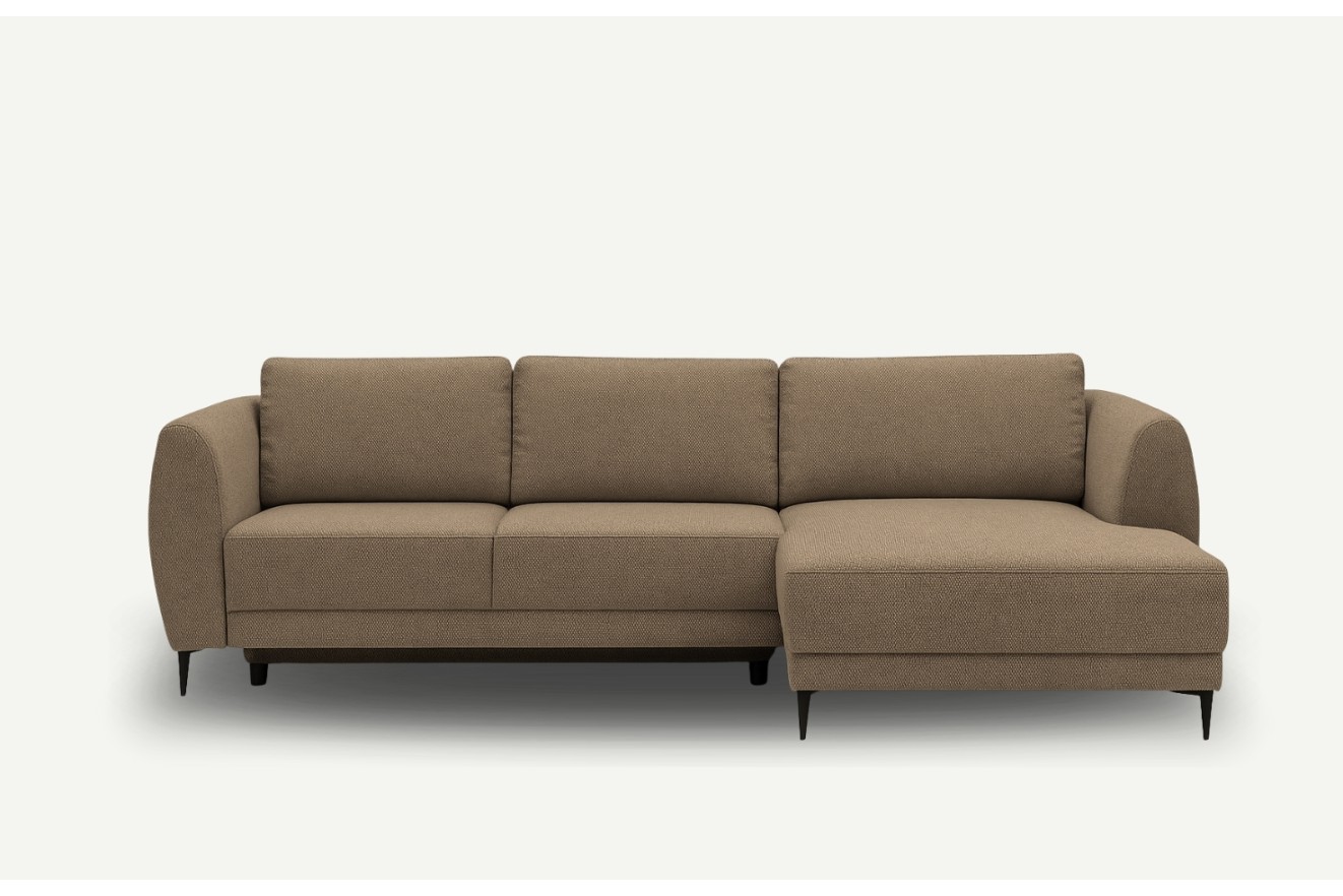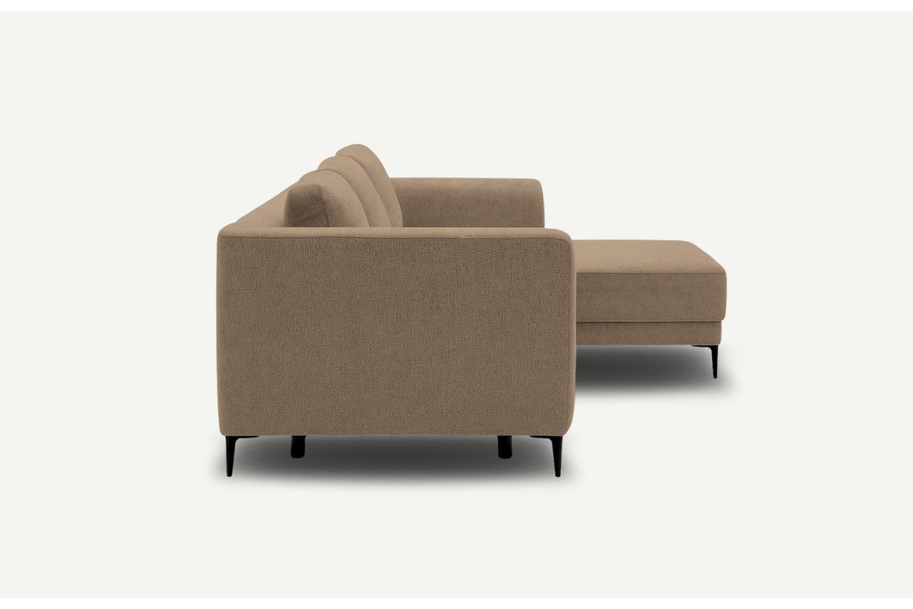 Całość uzupełniają wysokie, metalowe nogi w czarnym macie, które dodają bryle lekkości i nowoczesnego charakteru, a jednocześnie ułatwiają utrzymanie porządku w salonie. Narożnik Spazio to mebel, który łączy w sobie estetykę, wygodę i praktyczność – idealny wybór dla osób ceniących nowoczesny design i funkcjonalne rozwiązania.