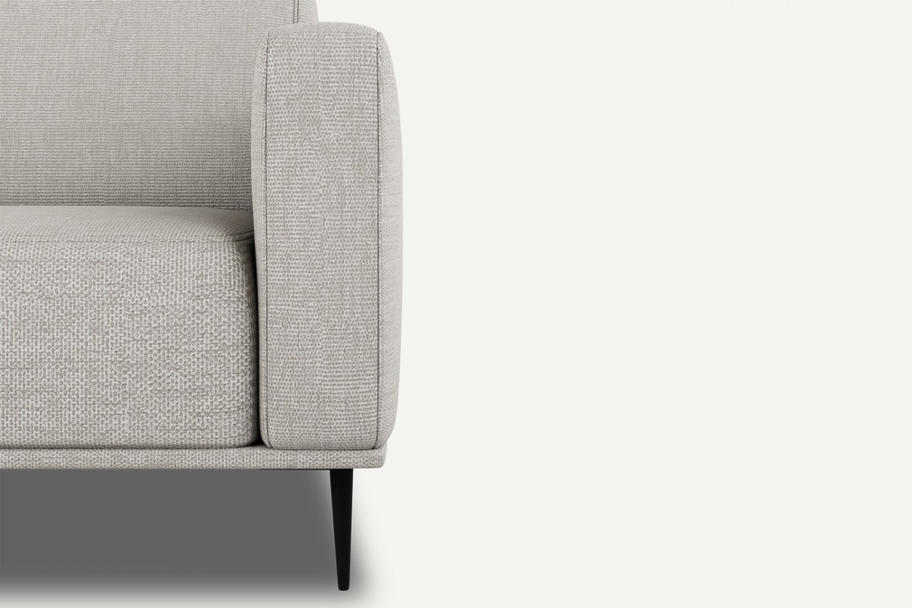 Smukłe, czarne metalowe nogi podkreślają lekkość formy, jednocześnie gwarantując stabilność mebla. To sofa, która idealnie wpisuje się w nowoczesne wnętrza – od przestronnych salonów po kompaktowe mieszkania i domowe biura. Doskonale wygląda samodzielnie, ale też jako część większego zestawu z fotelem lub narożnikiem Daglas.