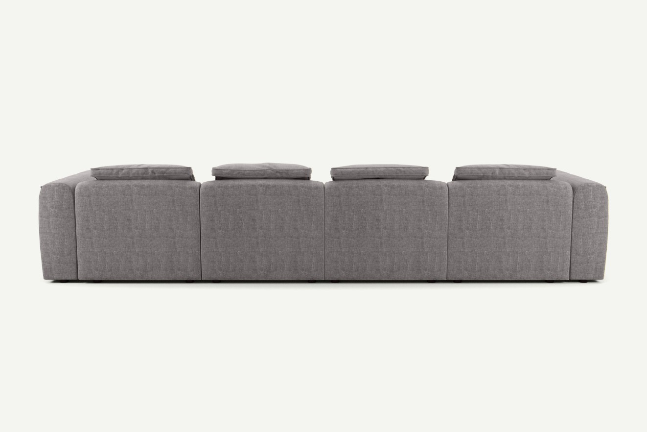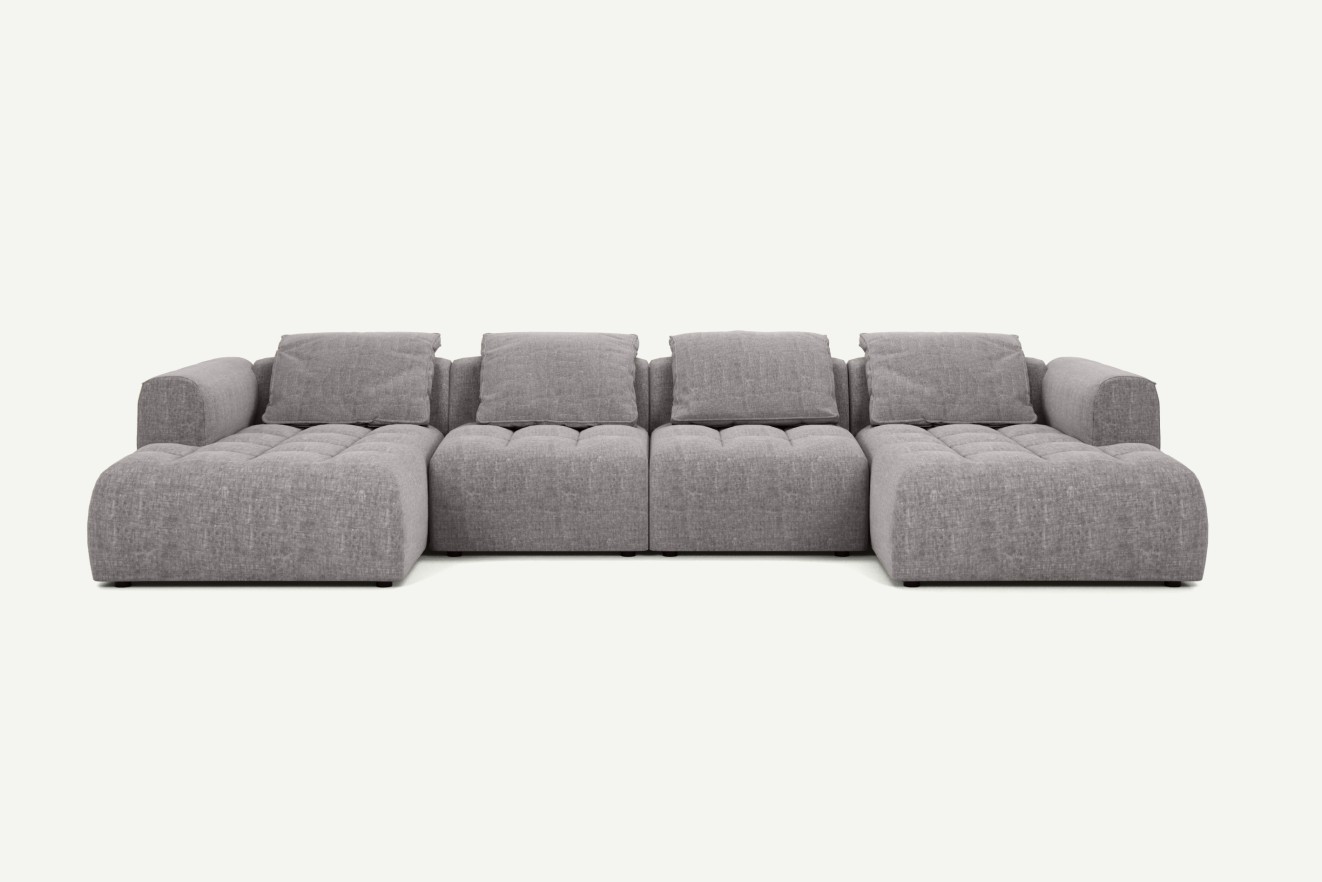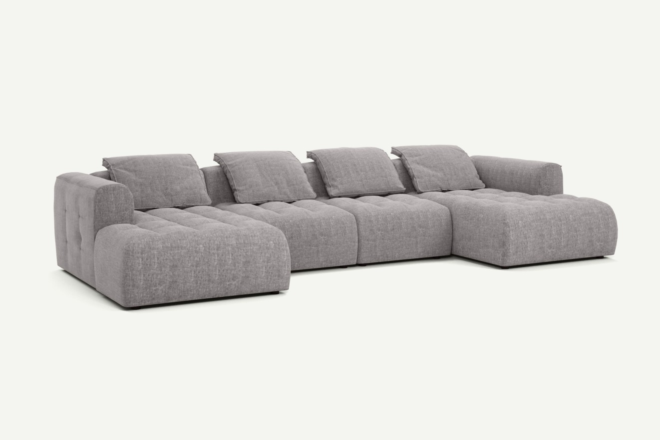 Narożnik w kształcie U z kolekcji Mosso to propozycja dla osób, które marzą o naprawdę dużej i wygodnej przestrzeni wypoczynkowej. Dzięki swojej formie mebel otacza domowników i gości, tworząc idealne warunki do wspólnego spędzania czasu – czy to podczas spotkań, oglądania filmów, czy popołudniowej drzemki.