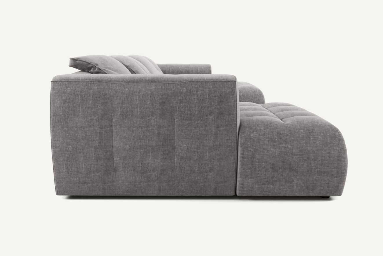 Wygodne, głębokie siedziska oraz miękkie poduchy zapewniają pełen komfort, a solidne wnętrze narożnika – z pianką wysokoelastyczną, pianką poliuretanową i sprężyną falistą – gwarantuje trwałość i odporność na codzienne użytkowanie. Nowoczesna, modułowa konstrukcja pozwala dopasować narożnik do dużych przestrzeni, a jego design podkreśla charakter nowoczesnego wnętrza.