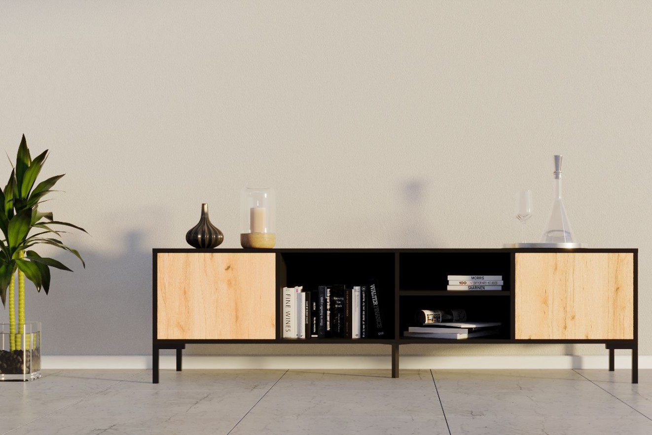 Fronty dwóch zamykanych szafek pozostają gładkie i estetyczne, a otwarte wnęki sprawiają, że sprzęt elektroniczny można ustawić w sposób wygodny i uporządkowany. Mechanizm push to open umożliwia otwieranie szafek lekkim naciskiem, eliminując konieczność stosowania tradycyjnych uchwytów i poprawiając komfort użytkowania.