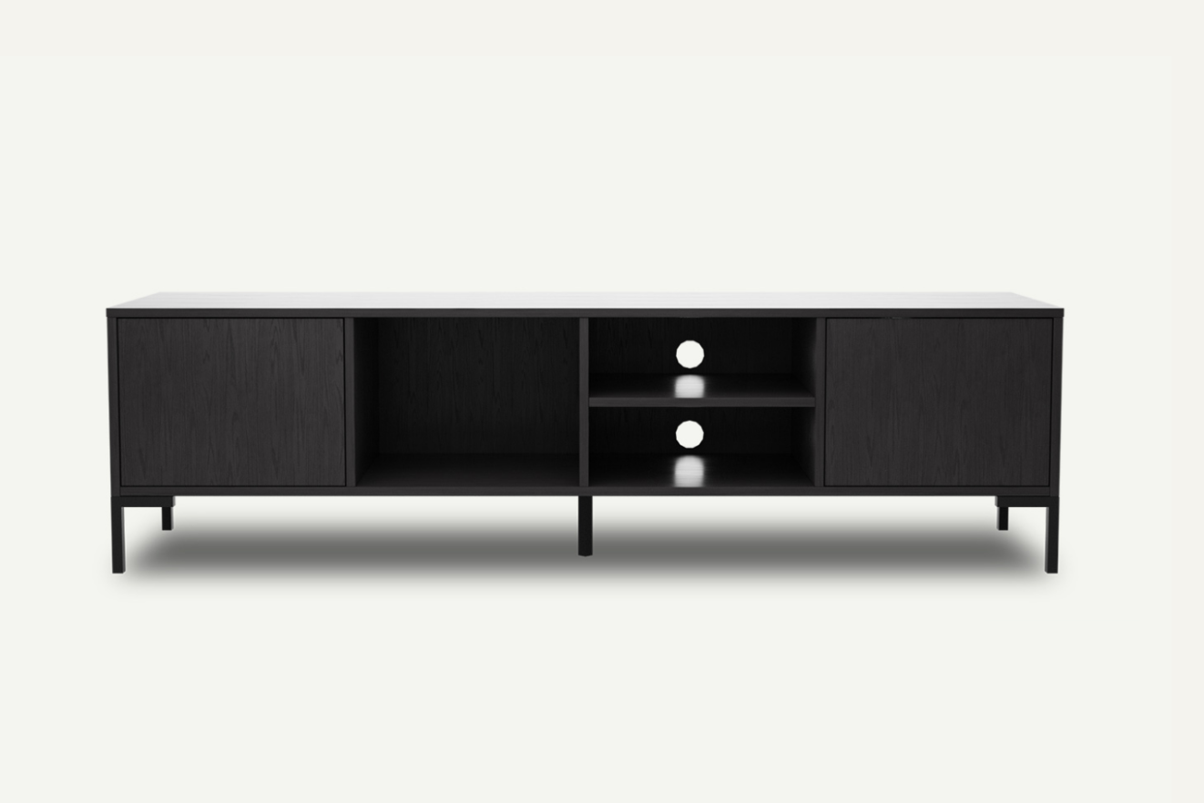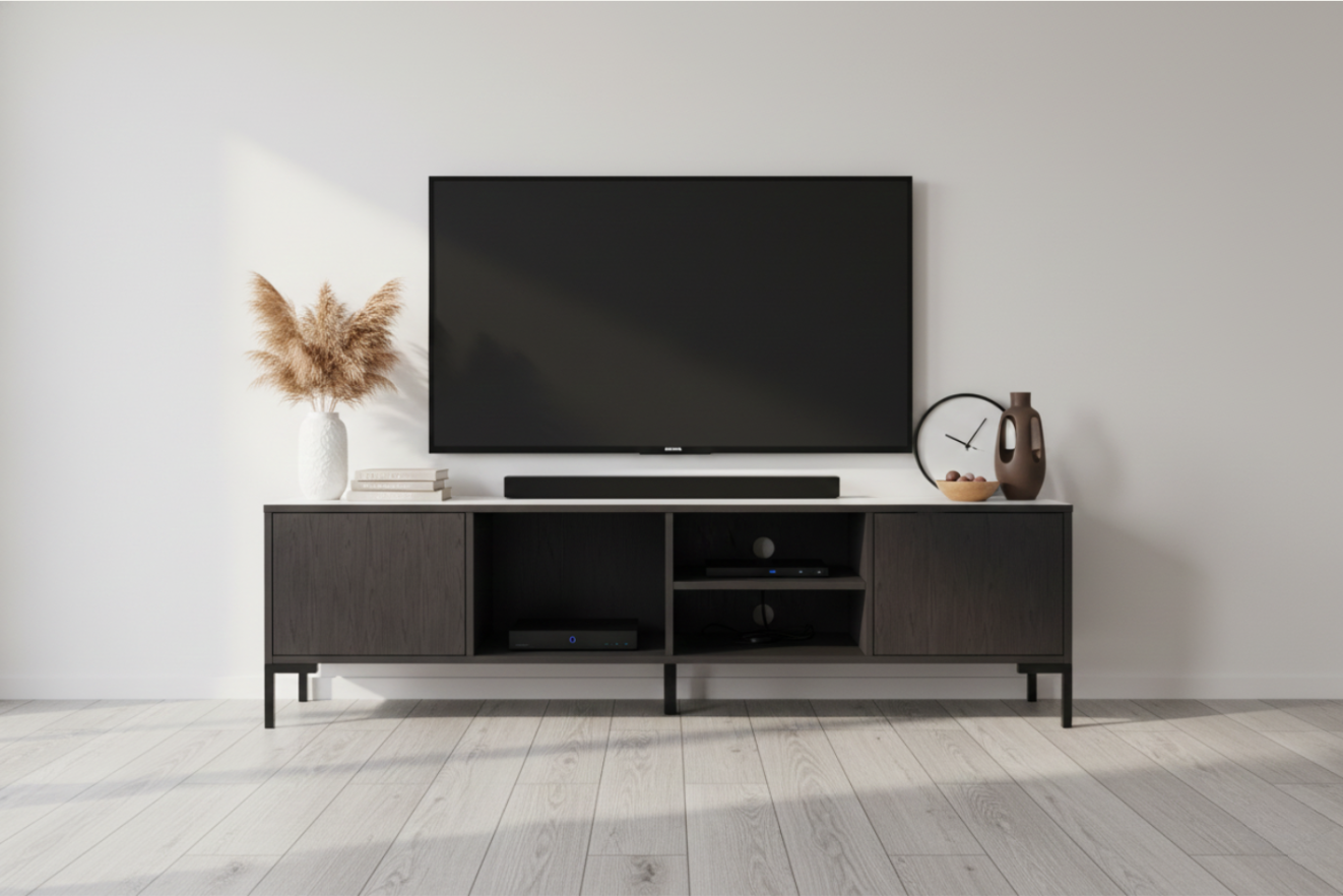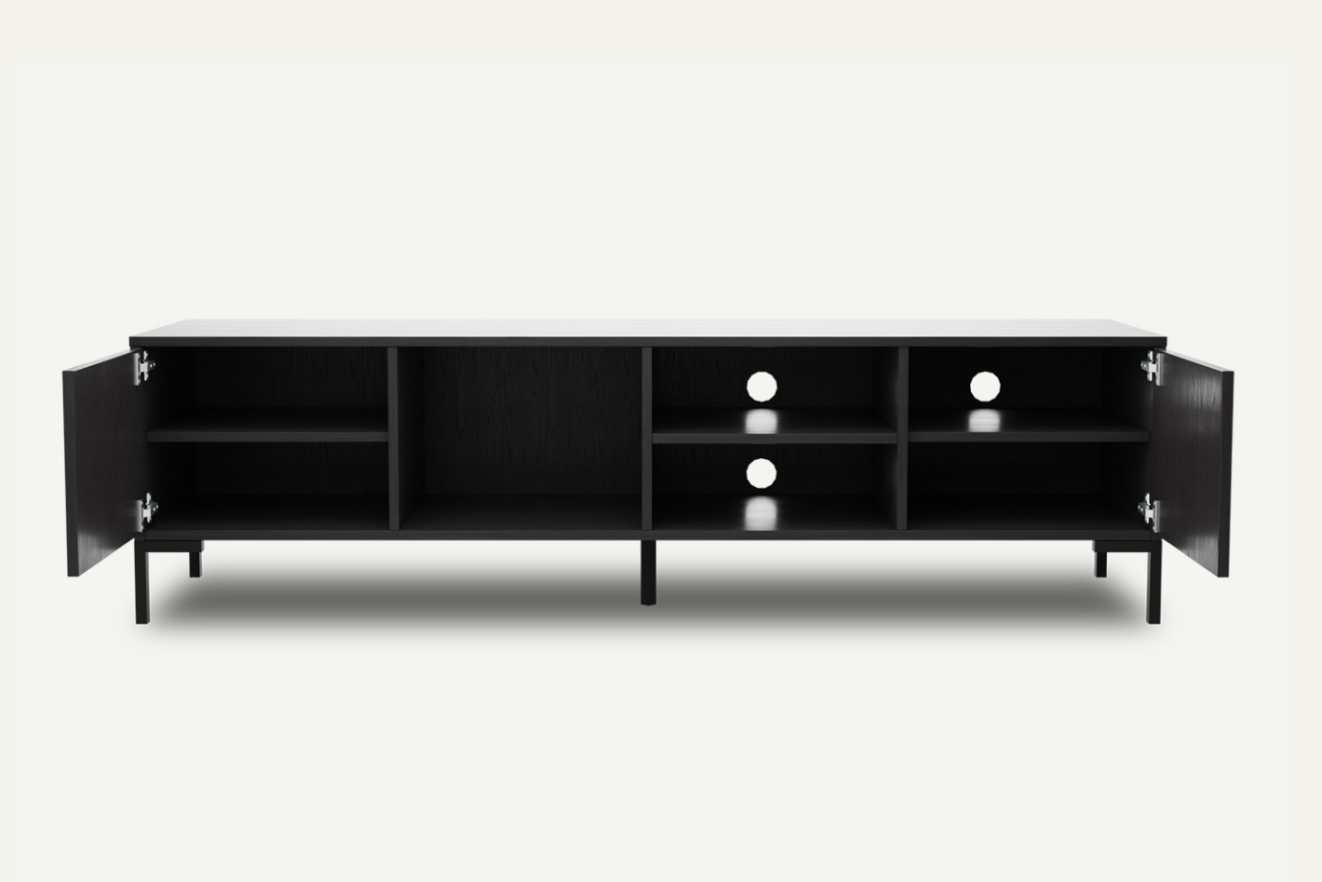 Fronty dwóch zamykanych szafek pozostają gładkie i estetyczne, a otwarte wnęki sprawiają, że sprzęt elektroniczny można ustawić w sposób wygodny i uporządkowany. Mechanizm push to open umożliwia otwieranie szafek lekkim naciskiem, eliminując konieczność stosowania tradycyjnych uchwytów i poprawiając komfort użytkowania.