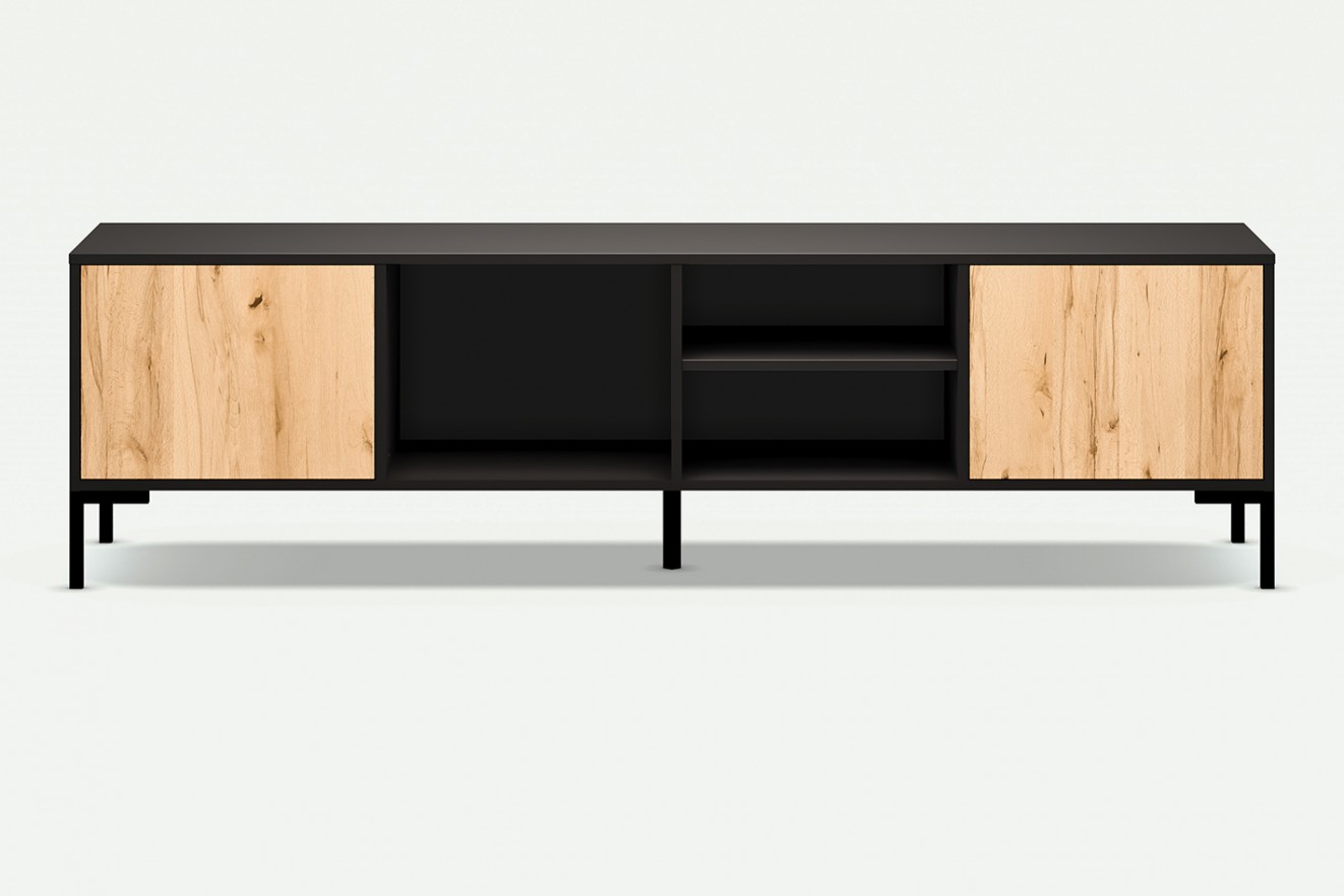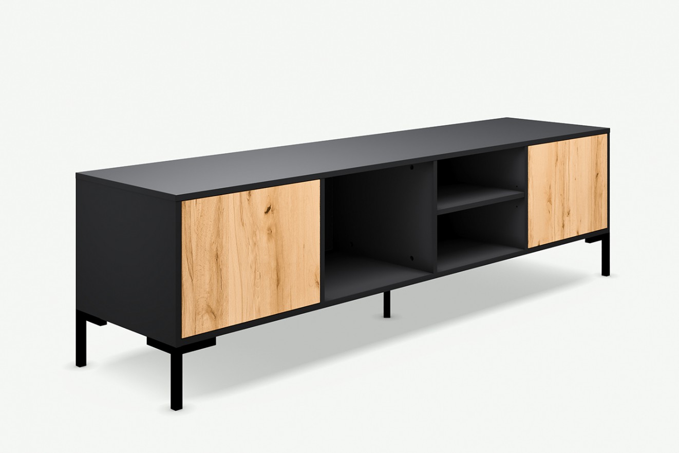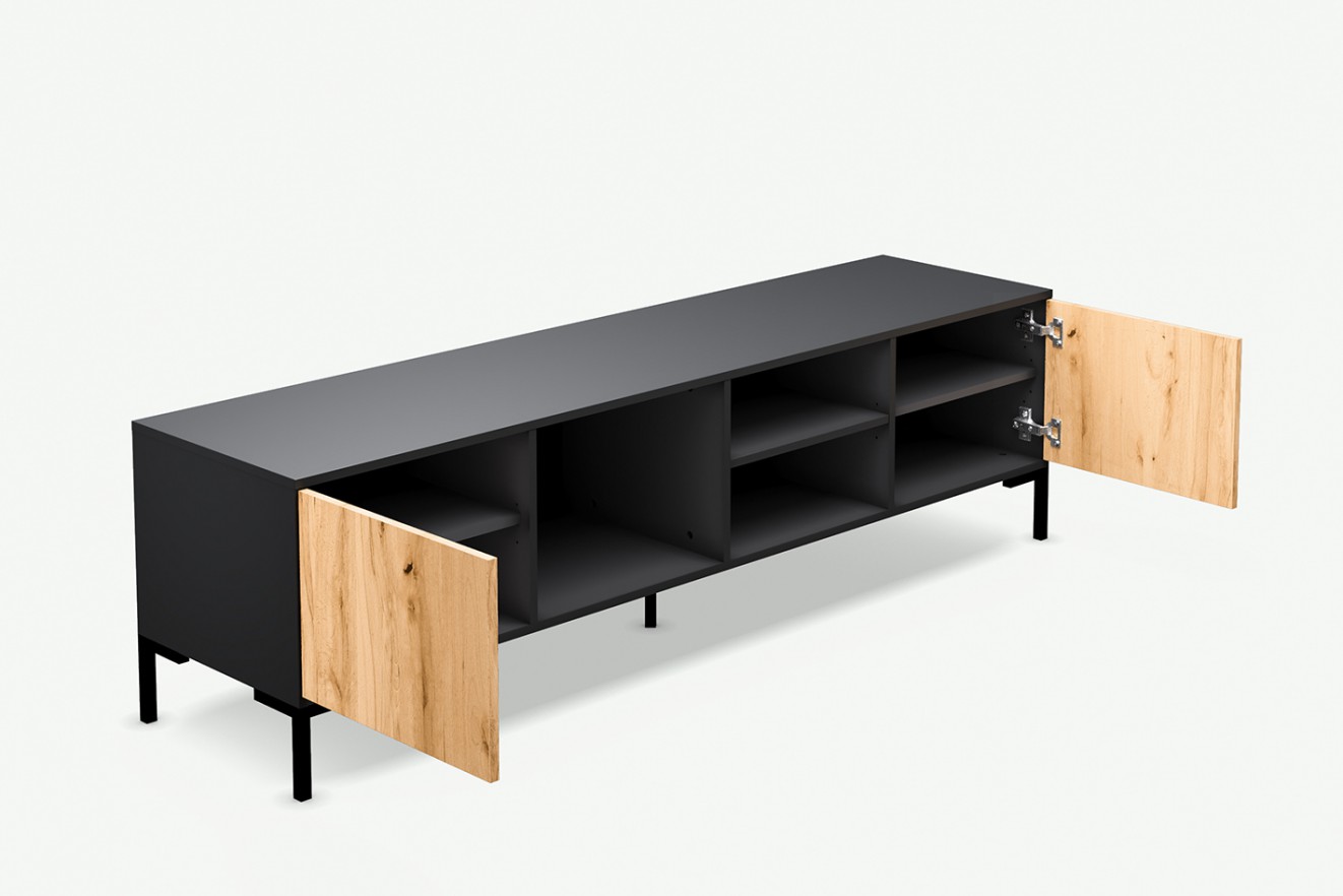 Mebel wyposażono w dwie zamykane szafki oraz otwarte półki, dzięki czemu łatwo wydzielić przestrzeń na sprzęt, akcesoria oraz elementy dekoracyjne. Gładkie fronty otwierane metodą push to open sprawiają, że bryła prezentuje się spójnie i nowocześnie, a użytkowanie jest wygodne i intuicyjne.