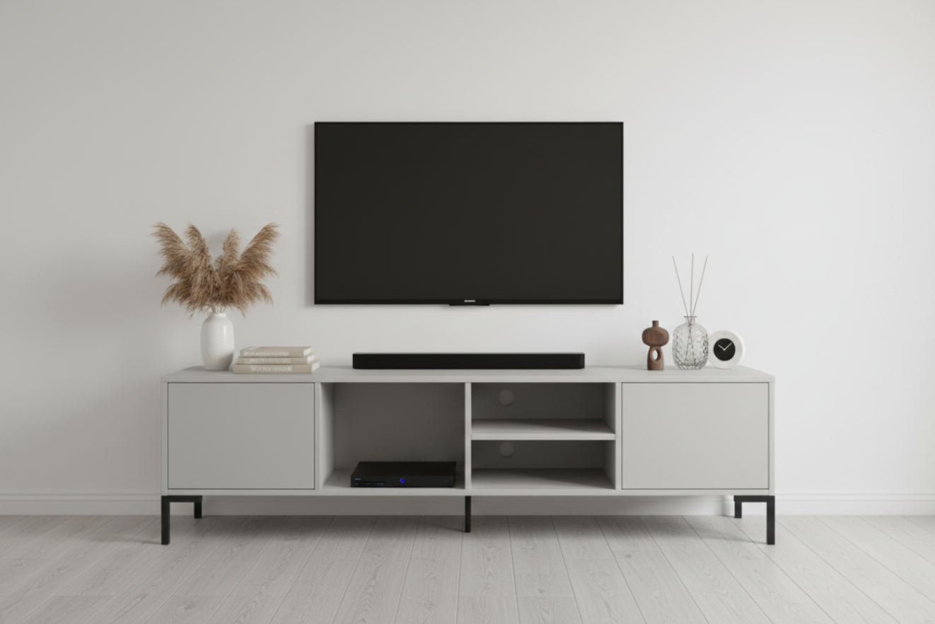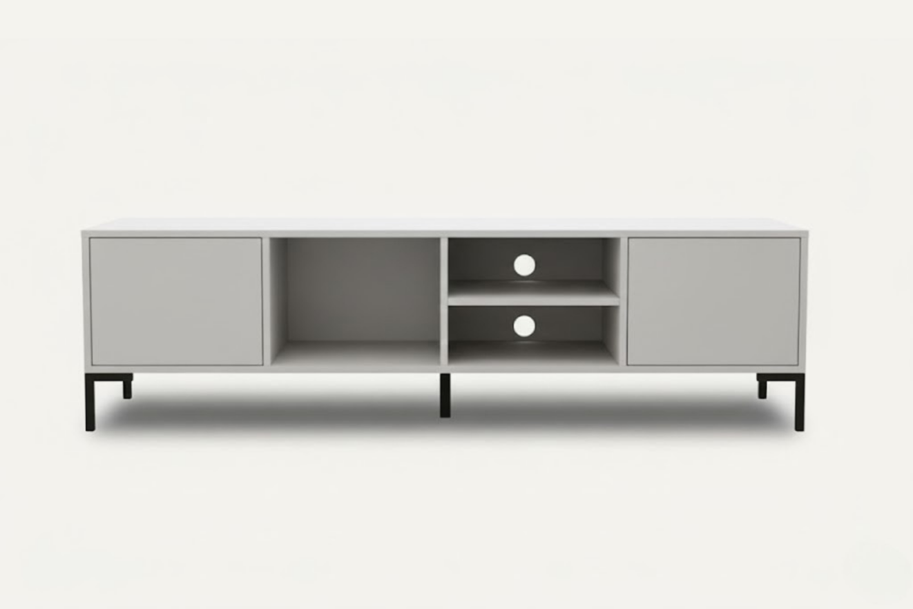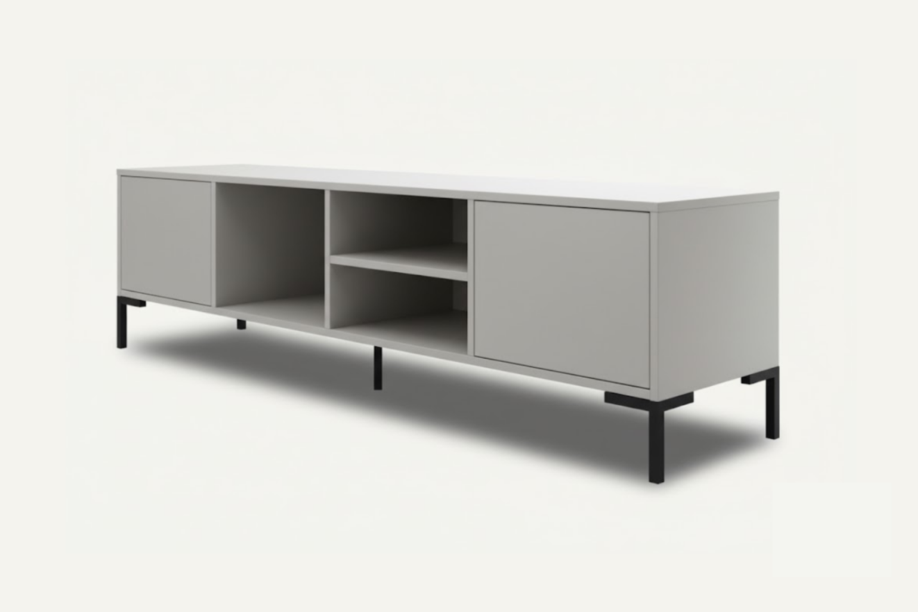 Mebel wyposażono w dwie zamykane szafki oraz otwarte półki, dzięki czemu łatwo wydzielić przestrzeń na sprzęt, akcesoria oraz elementy dekoracyjne. Gładkie fronty otwierane metodą push to open sprawiają, że bryła prezentuje się spójnie i nowocześnie, a użytkowanie jest wygodne i intuicyjne.