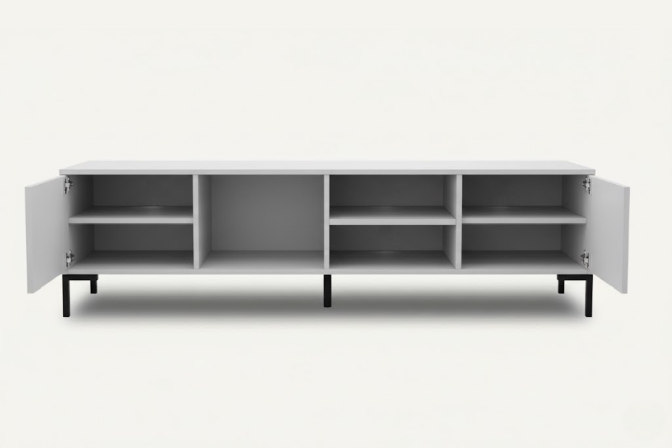 Przestronna szafka pod telewizor o nowoczesnym układzie przechowywania, łącząca praktyczne rozwiązania z prostą, uporządkowaną formą. Wyposażona w system push to open oraz stabilne metalowe nogi. Model dostarczany w całości, bez konieczności montażu.