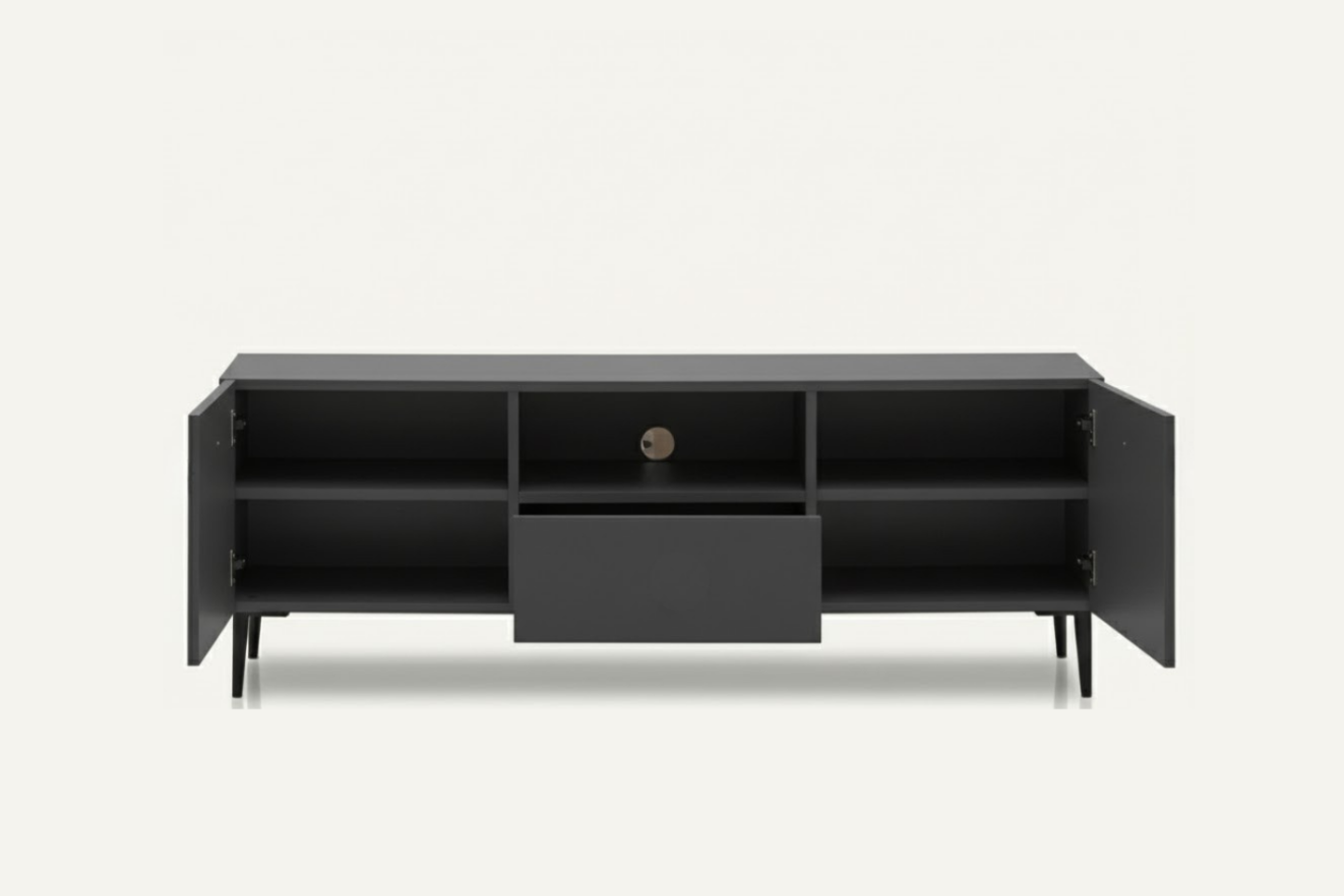 Wnętrze mebla zaprojektowano tak, aby ułatwić organizację przestrzeni. Centralna szuflada pomieści drobne akcesoria, boczne komory pozwolą ukryć większe urządzenia, a otwarta półka z otworem na przewody to idealne miejsce na dekoder lub konsolę. Dzięki temu cała strefa RTV pozostaje uporządkowana i estetyczna.