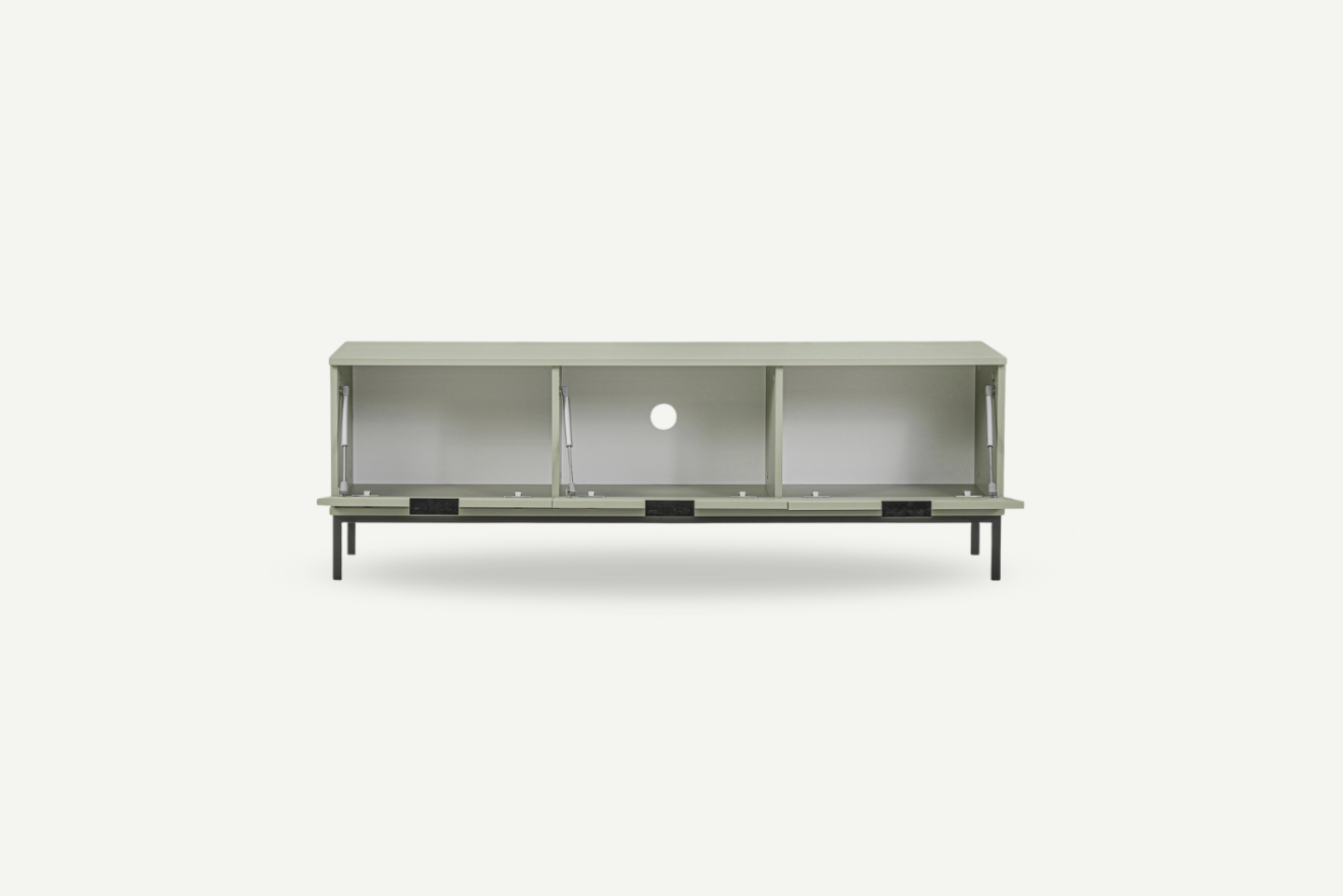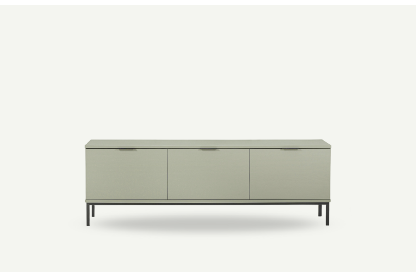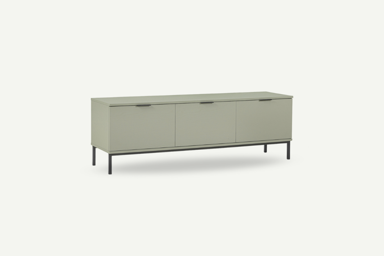 Szafka RTV Eucalyx 150 trzydrzwiowa w kolorze zielonym to funkcjonalny mebel do salonu, który pomaga uporządkować sprzęt multimedialny i akcesoria. Trzy zamykane fronty zapewniają wygodne przechowywanie, a czarne nóżki nadają bryle lekkości i ułatwiają sprzątanie. Dobrze sprawdzi się w nowoczesnych aranżacjach.