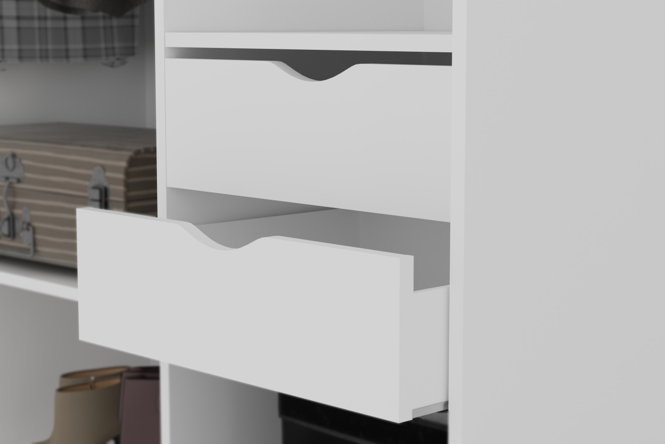 Wnętrze szafy zostało zaplanowane w sposób funkcjonalny i czytelny. Przestrzeń na ubrania wiszące umożliwia wygodne przechowywanie koszul, płaszczy i sukienek, a układ półek i szuflad pozwala na uporządkowanie odzieży składanej, pościeli oraz dodatków. Jej zwiększona głębokość ma bezpośredni wpływ na komfort przechowywania ubrań, które swobodnie wiszą na wieszakach i nie ocierają się o fronty ani nie gniotą podczas zamykania drzwi. Dzięki temu szafa sprawdzi się zarówno jako główne miejsce do przechowywania garderoby, jak i uzupełnienie zabudowy w mniejszych wnętrzach.
