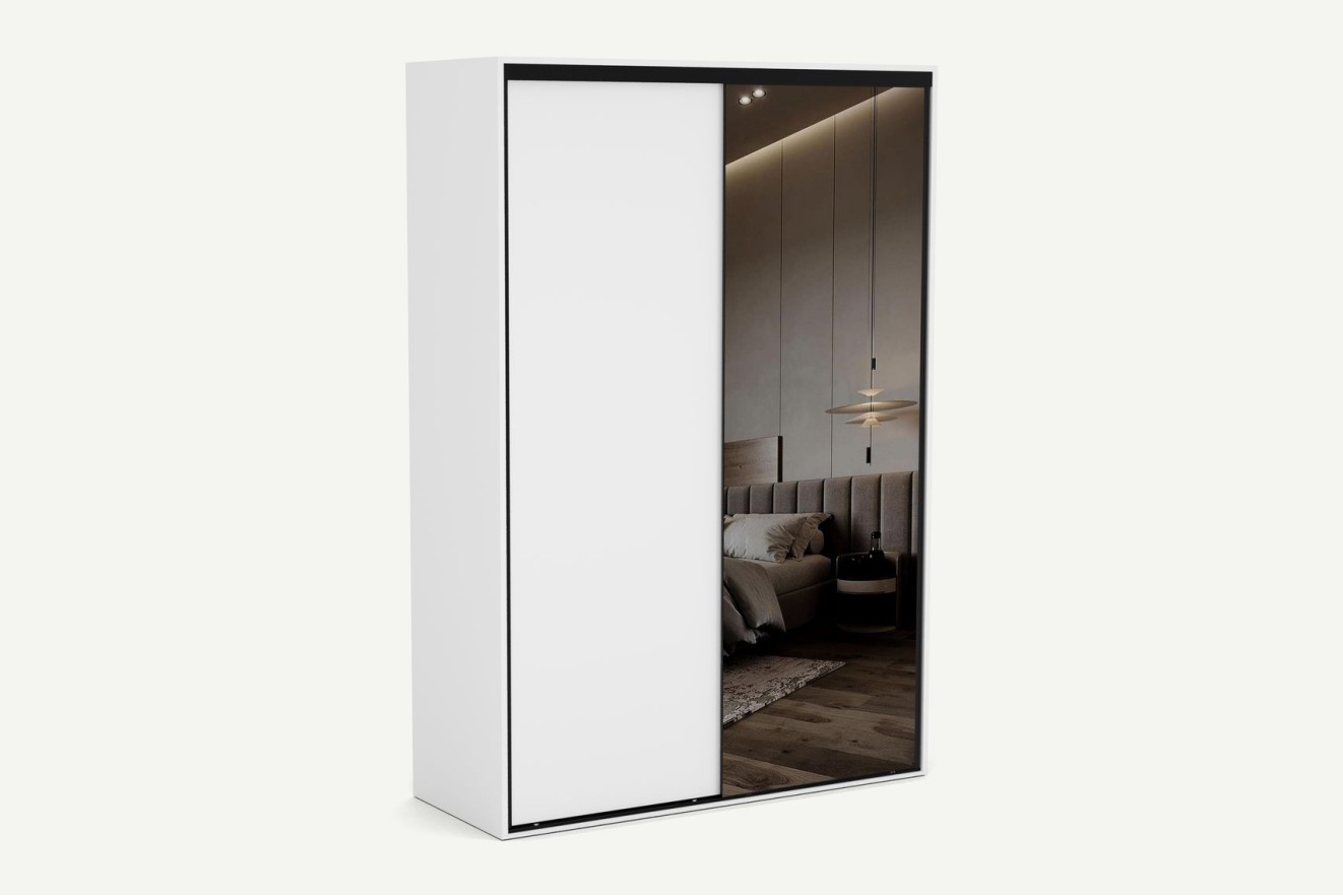 Szafa przesuwna 160 cm z lustrem została zaprojektowana z myślą o maksymalnym wykorzystaniu przestrzeni i wygodzie użytkowania na co dzień. System drzwi przesuwnych sprawdzi się szczególnie w pomieszczeniach, gdzie liczy się oszczędność miejsca i swobodny dostęp do wnętrza szafy, bez konieczności zachowania dodatkowej przestrzeni przed meblem.