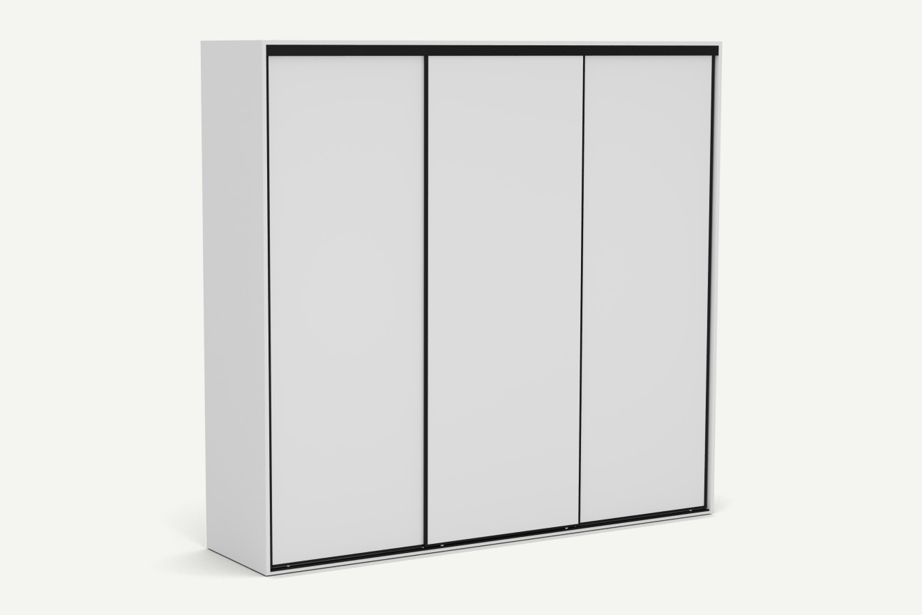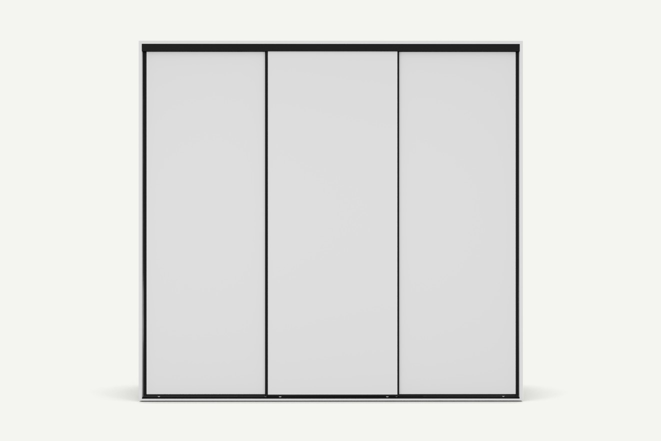 System drzwi przesuwnych to praktyczne rozwiązanie do dużych mebli – nie wymaga dodatkowej przestrzeni przed szafą i zapewnia łatwy dostęp do wnętrza nawet w węższych pomieszczeniach. Płynna praca mechanizmu zwiększa komfort codziennego użytkowania, a szeroki front podkreśla nowoczesny charakter mebla.