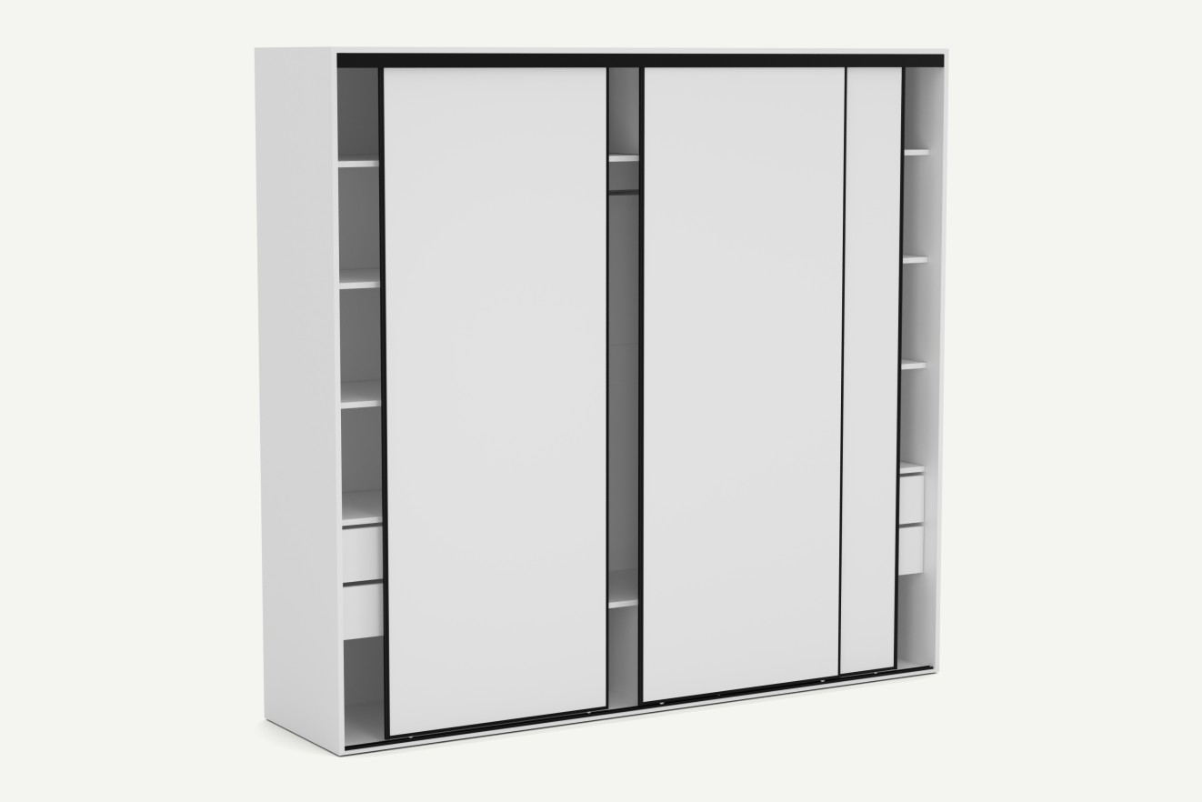 System drzwi przesuwnych to praktyczne rozwiązanie do dużych mebli – nie wymaga dodatkowej przestrzeni przed szafą i zapewnia łatwy dostęp do wnętrza nawet w węższych pomieszczeniach. Płynna praca mechanizmu zwiększa komfort codziennego użytkowania, a szeroki front podkreśla nowoczesny charakter mebla.