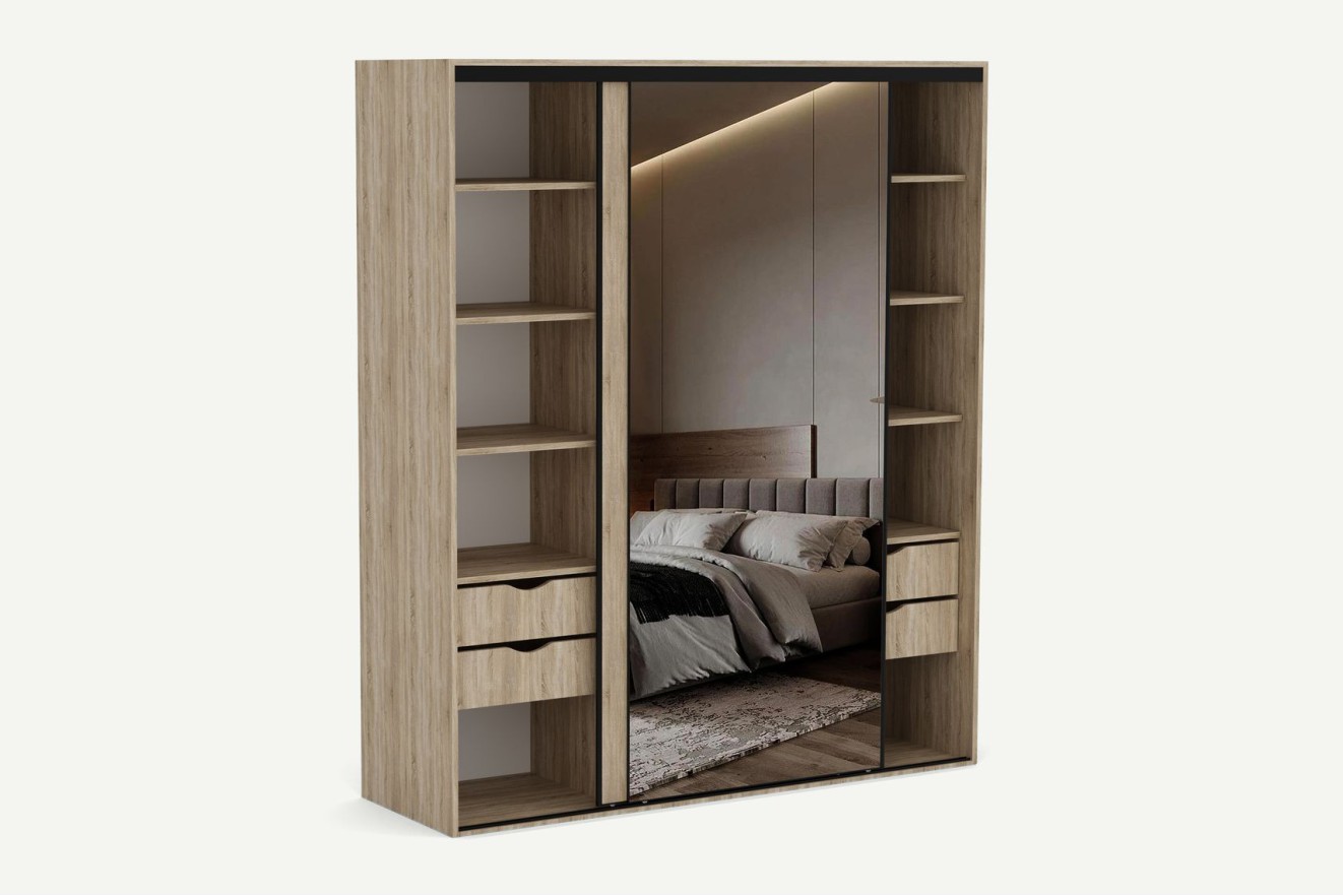 Wnętrze szafy zostało podzielone w sposób praktyczny i czytelny. Centralna strefa z drążkiem umożliwia wygodne wieszanie ubrań, a liczne półki i pojemne szuflady pozwalają na uporządkowanie odzieży składanej, pościeli oraz dodatków. Taki układ sprawia, że cała garderoba ma swoje miejsce i pozostaje łatwo dostępna na co dzień.