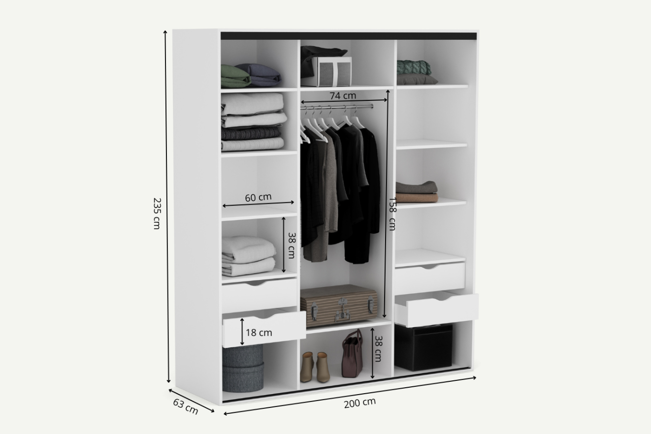 Wnętrze szafy zostało podzielone w sposób praktyczny i czytelny. Centralna strefa z drążkiem umożliwia wygodne wieszanie ubrań, a liczne półki i pojemne szuflady pozwalają na uporządkowanie odzieży składanej, pościeli oraz dodatków. Taki układ sprawia, że cała garderoba ma swoje miejsce i pozostaje łatwo dostępna na co dzień.